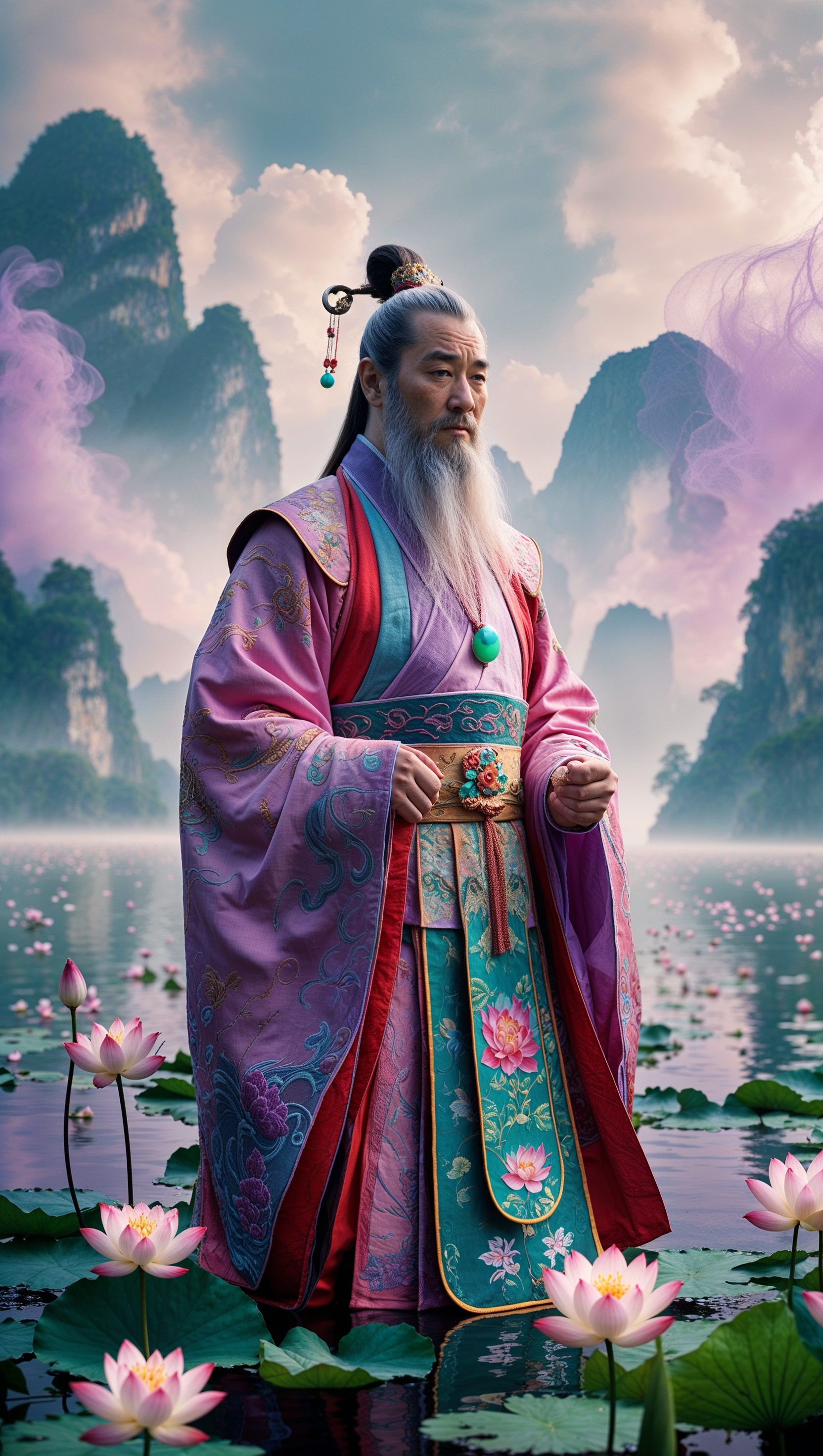 1664x2944 An image of Po in traditional Chinese attire by a lake with lotus flowers
