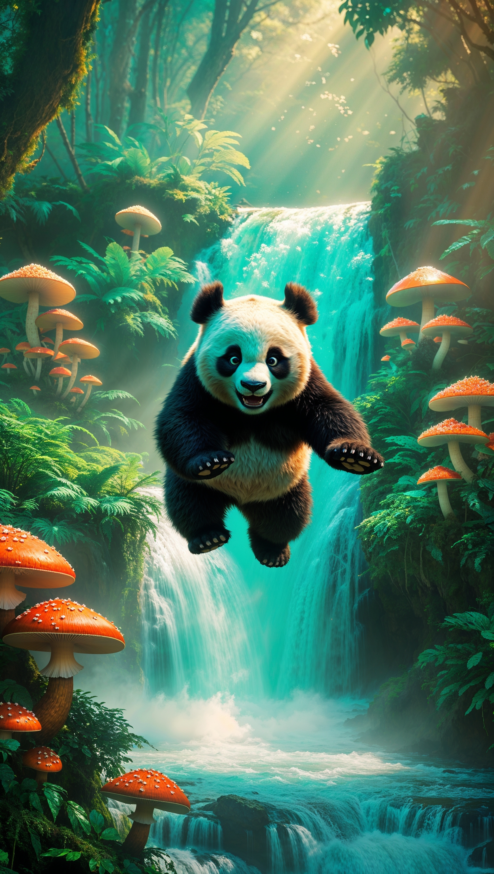 1664x2944 Po jumping over a waterfall in a magical forest