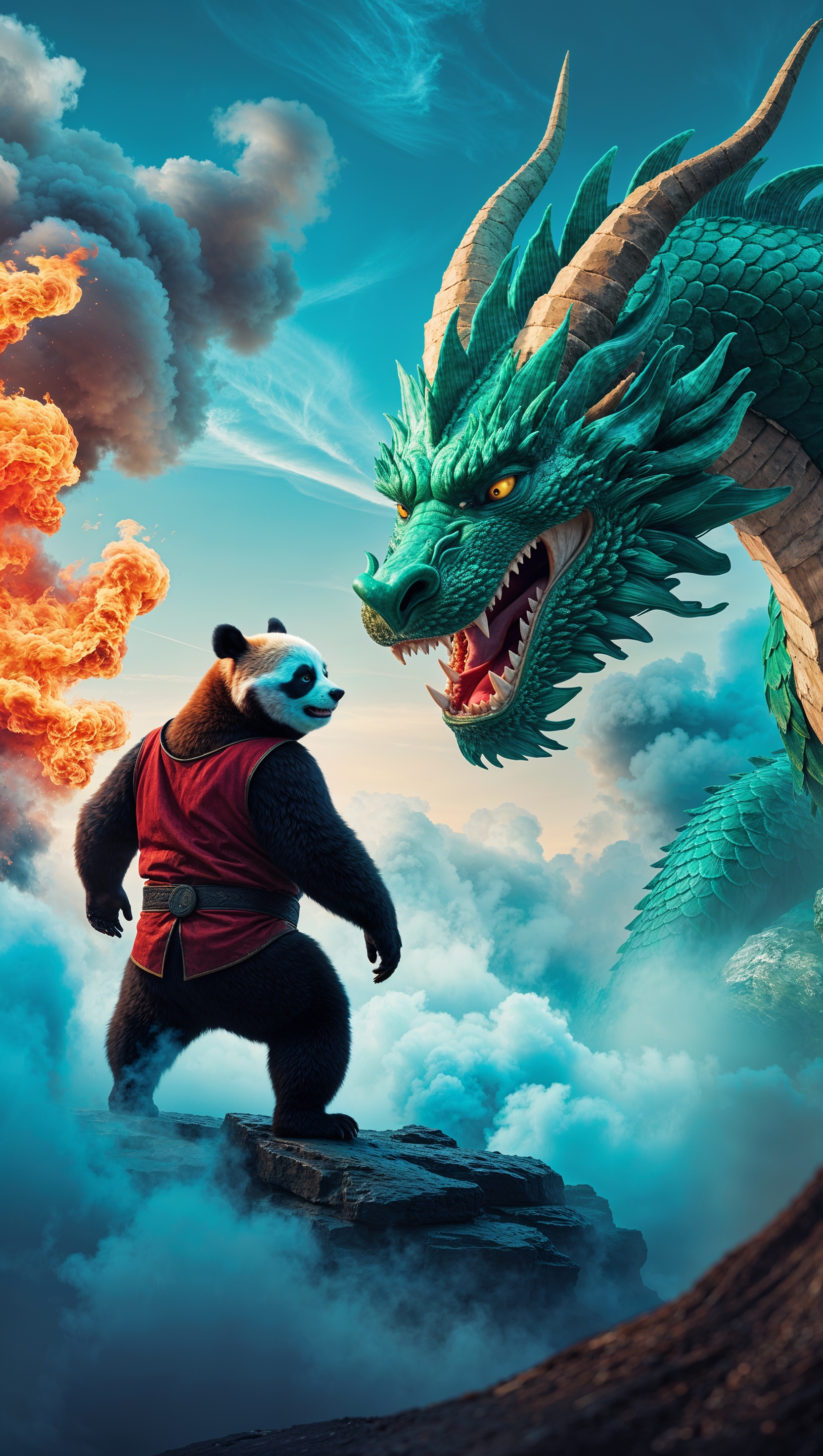 1664x2944 A fantasy scene of Po facing a fire-breathing dragon