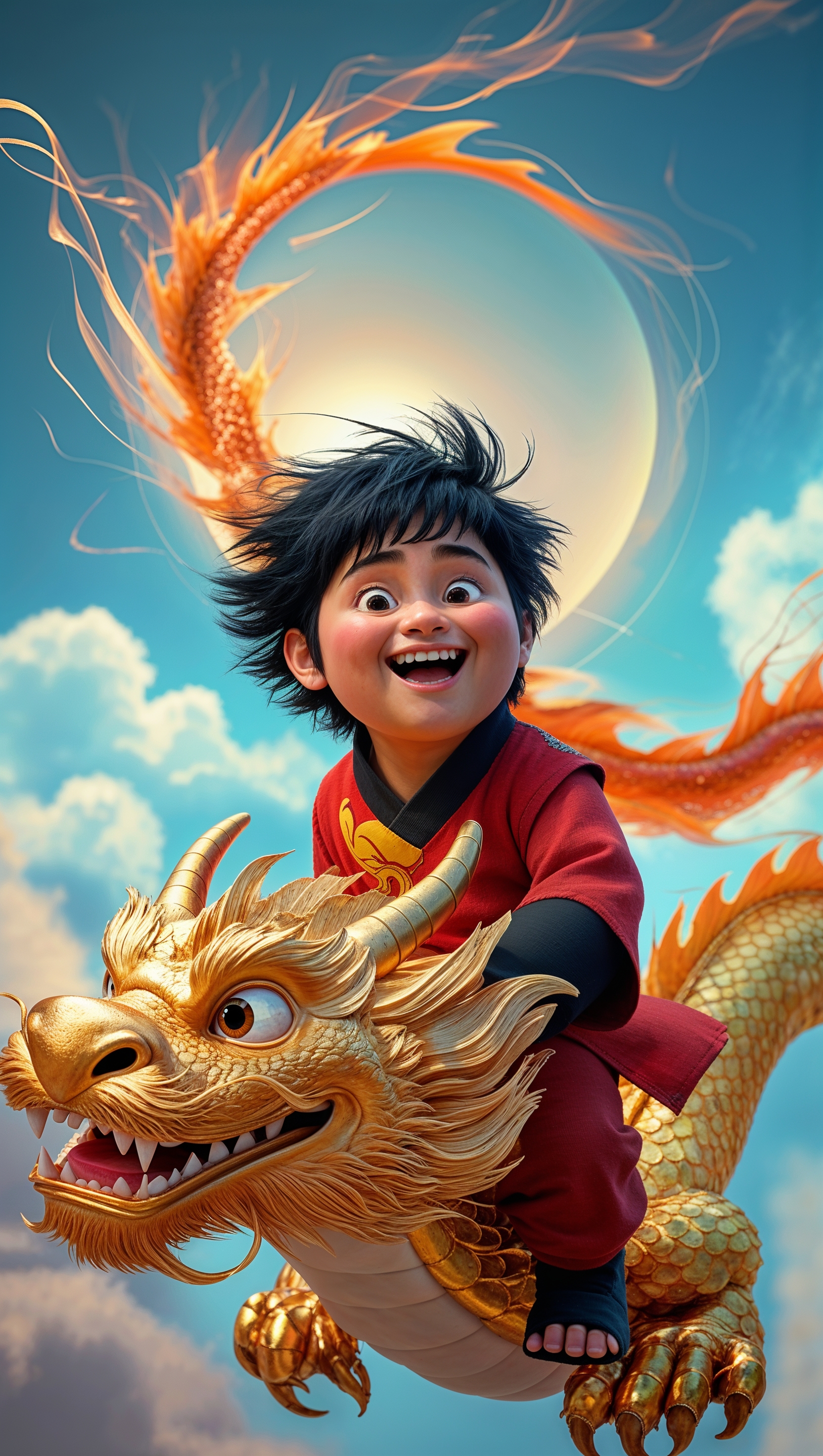 1664x2944 A fantasy image of Po riding a golden dragon