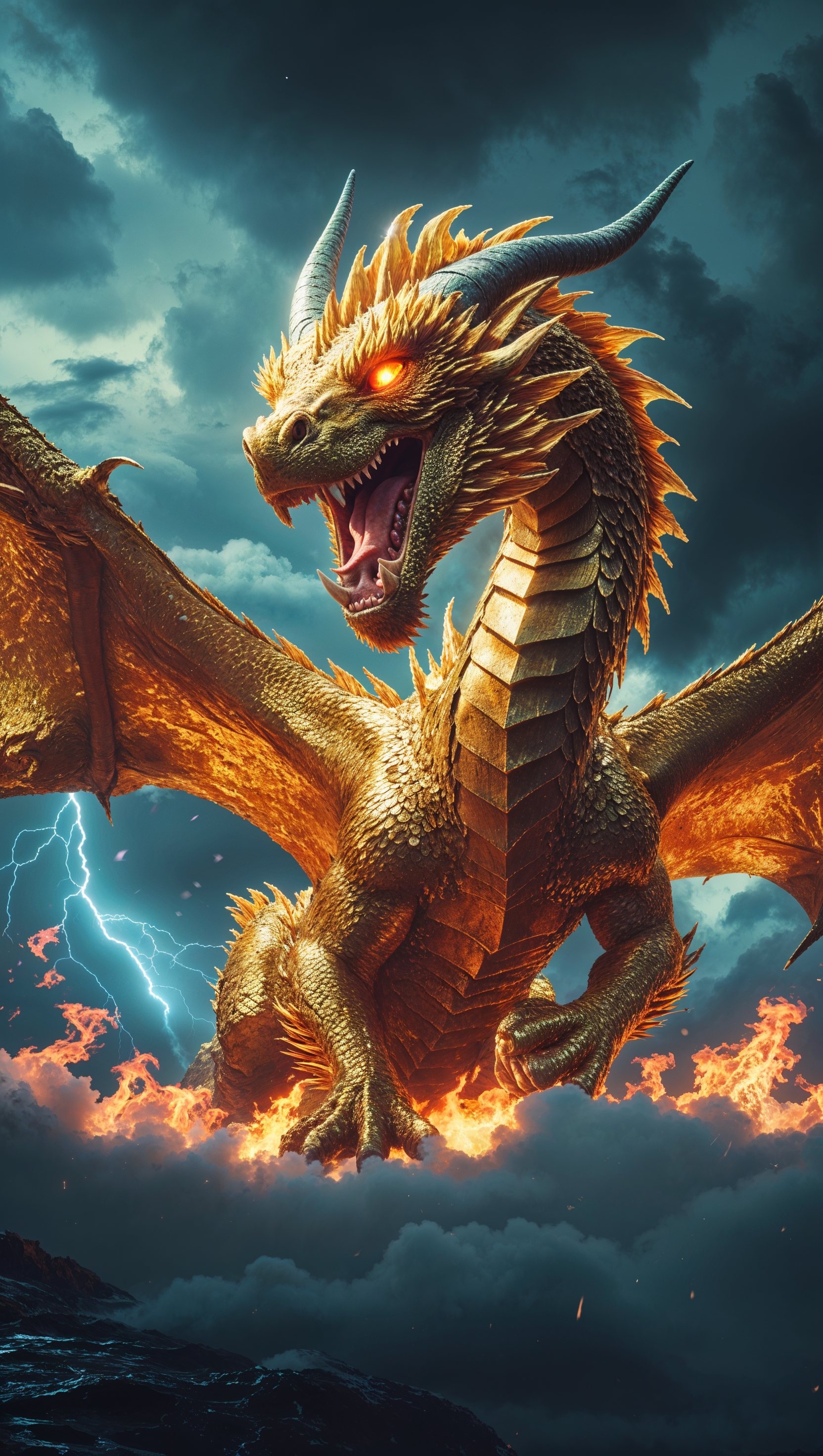 1664x2944 An invincible dragon with golden scales, fire-breathing, stormy sky – 4K iPhone