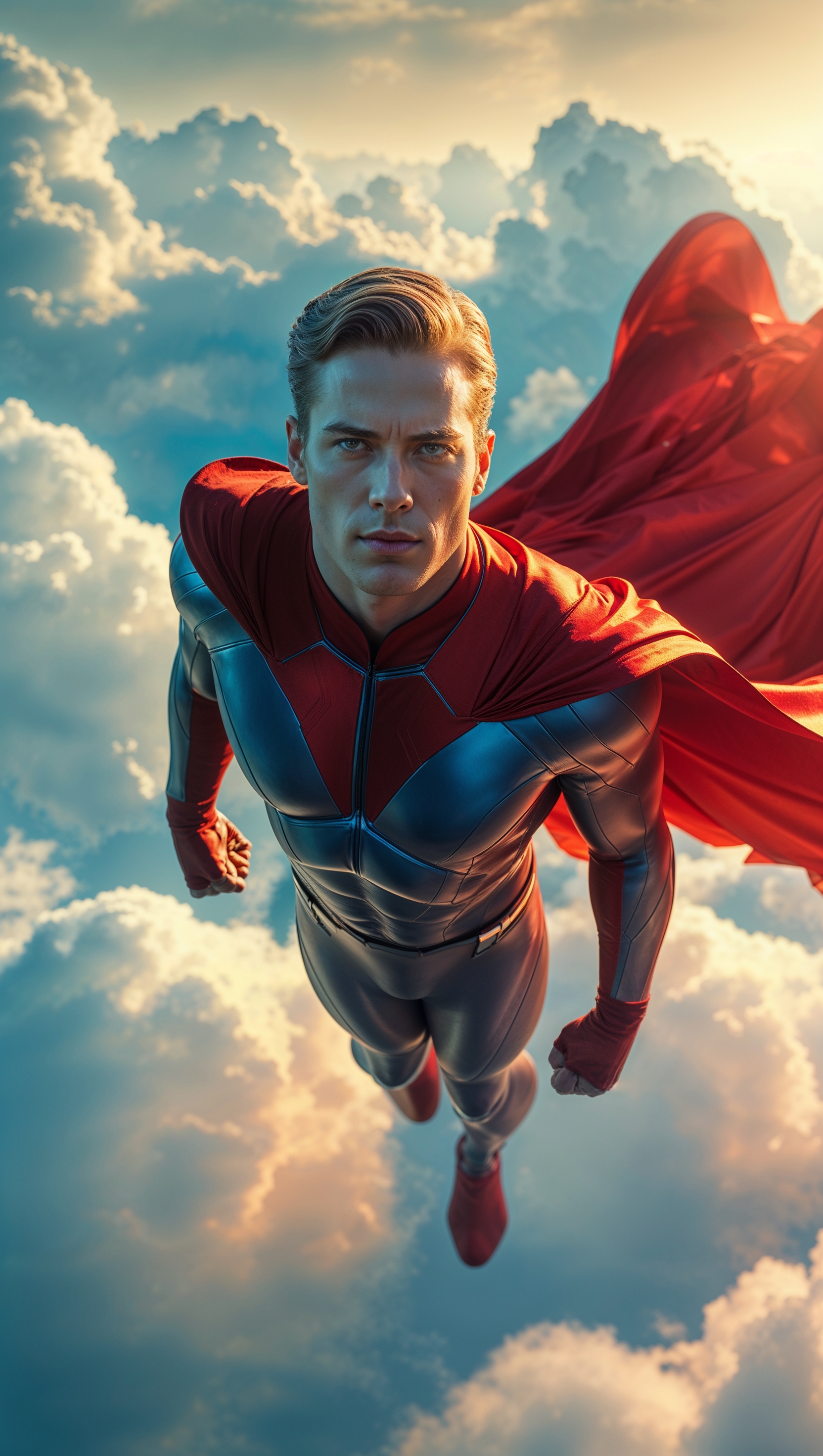 1664x2944 An invincible superhero flying with a red cape among the clouds – 4K iPhone wallpaper