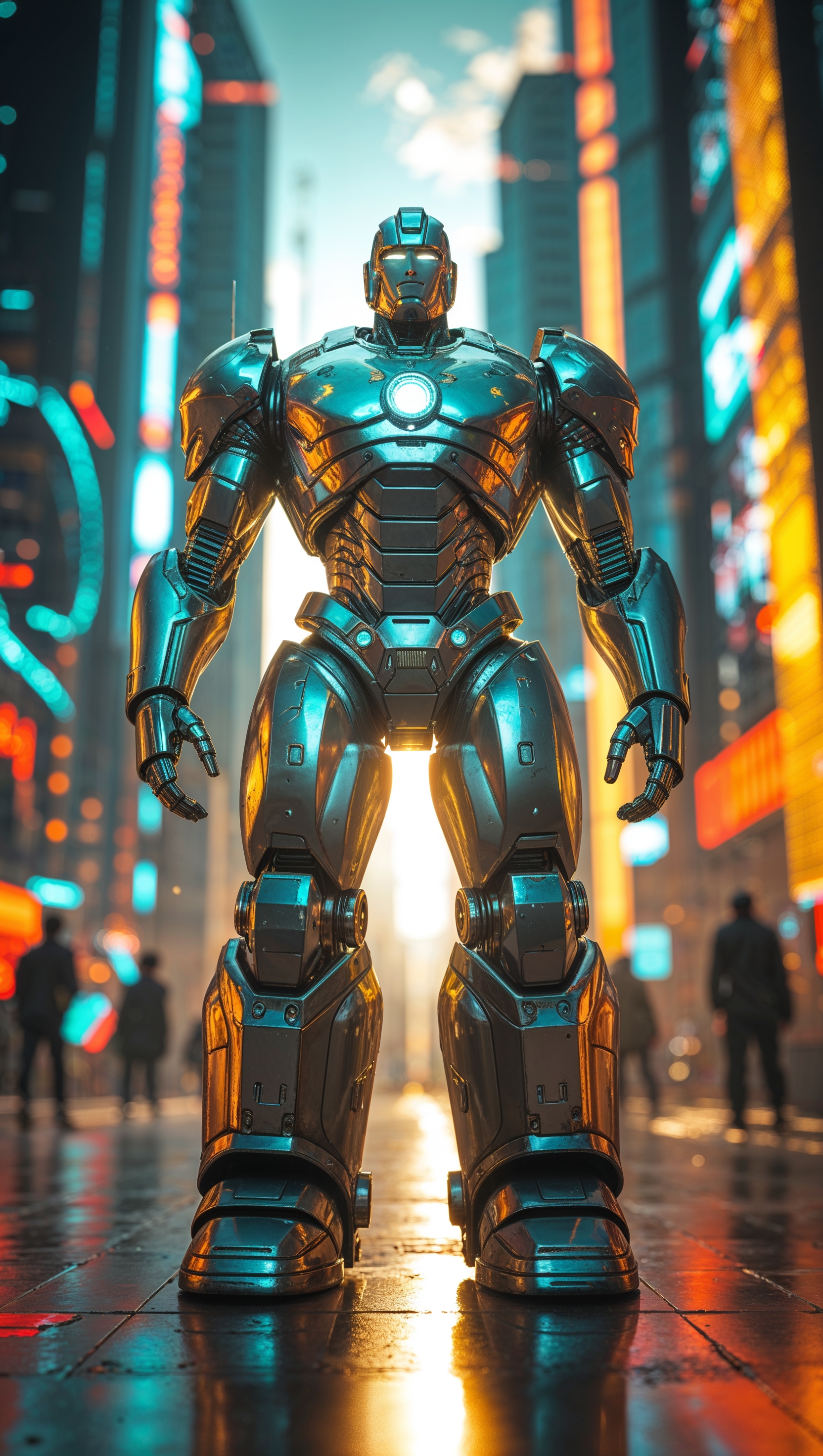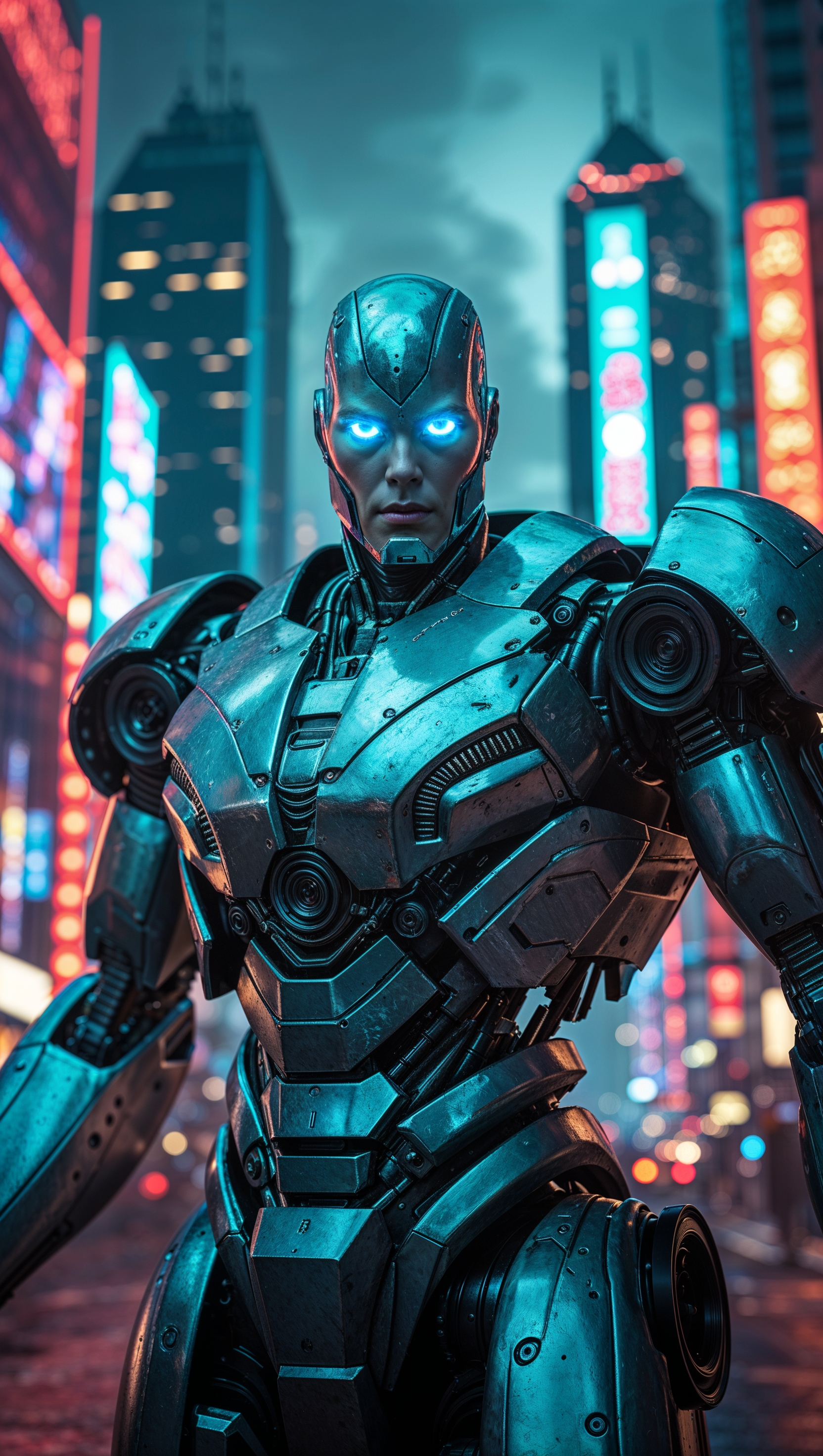 1664x2944 An invincible robot with glowing eyes and advanced armor, neon city background – 4K
