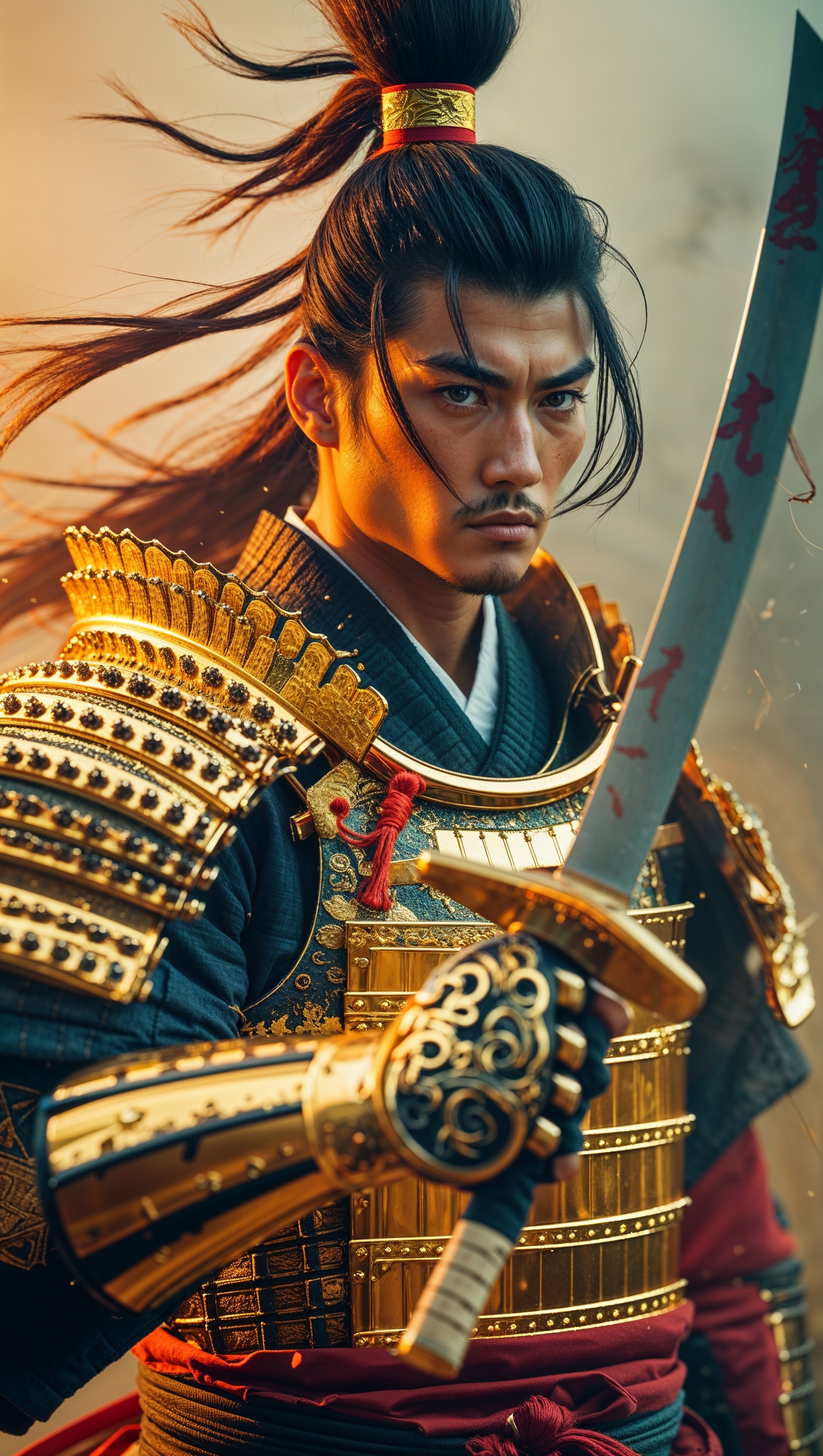 1664x2944 A samurai warrior with golden armor, drawn sword, and an aura of power – 4K iPhone