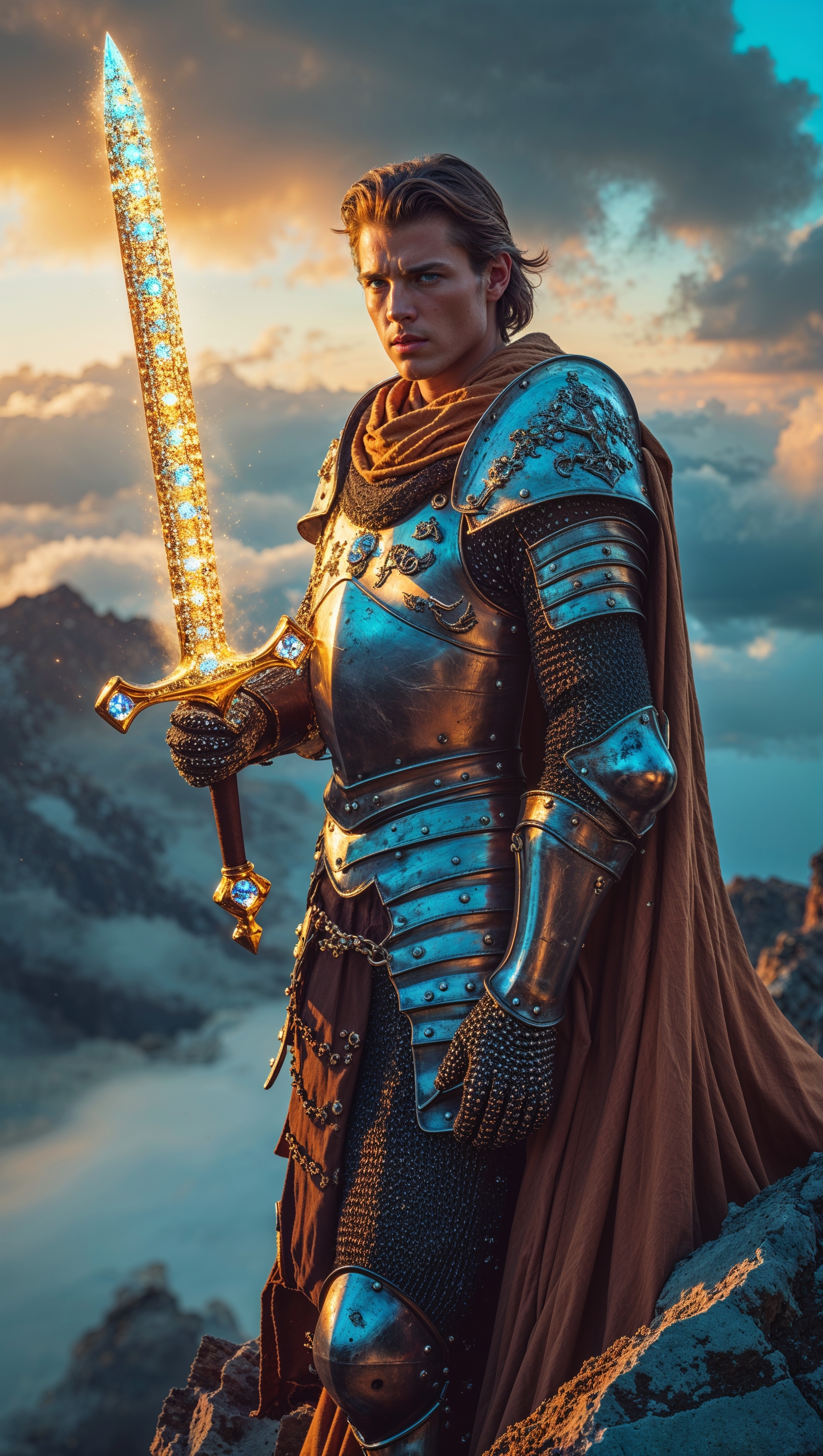 1664x2944 A legendary knight standing on a peak, glowing sword in hand, epic background – 4K iPhone
