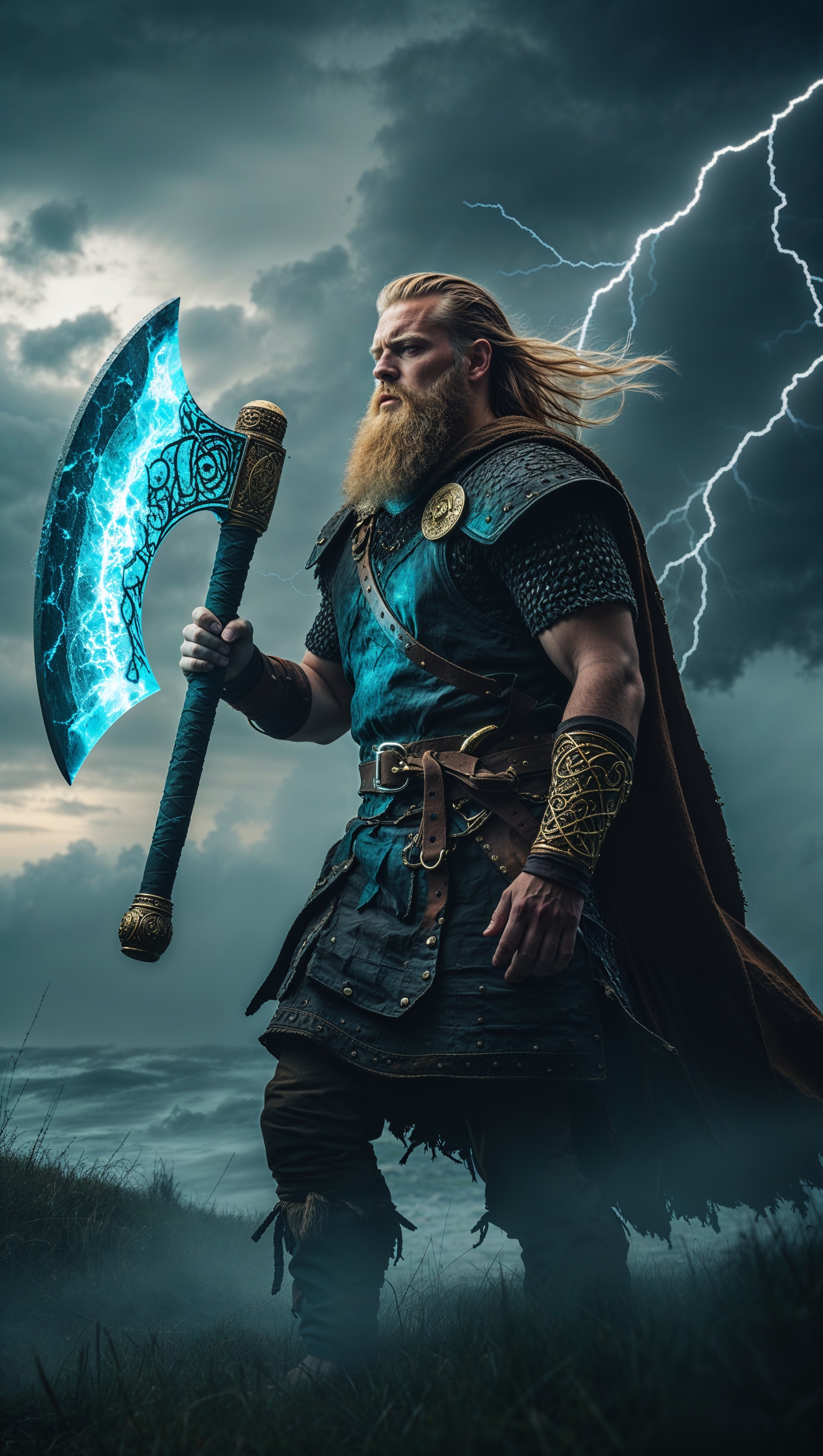 1664x2944 A Viking warrior with a glowing axe, standing against a storm, invincible power – 4K iPhone