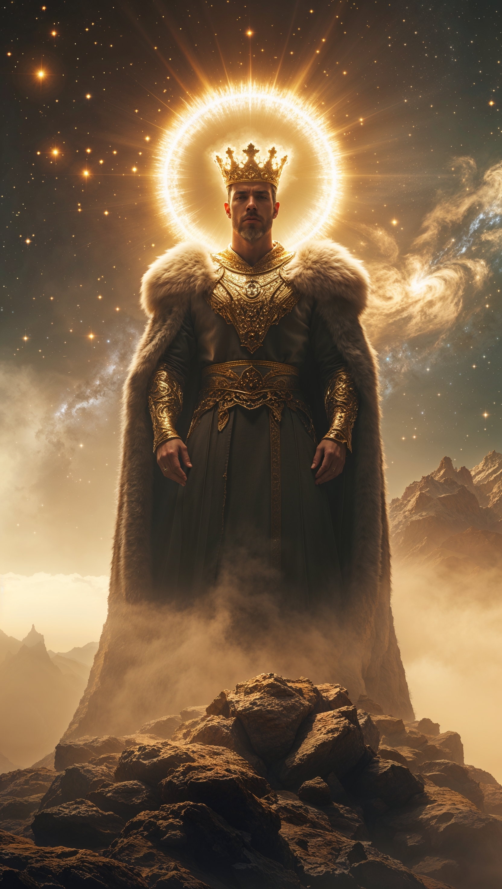 1664x2944 An invincible king with a crown of light, standing on a mountain, starry sky – 4K
