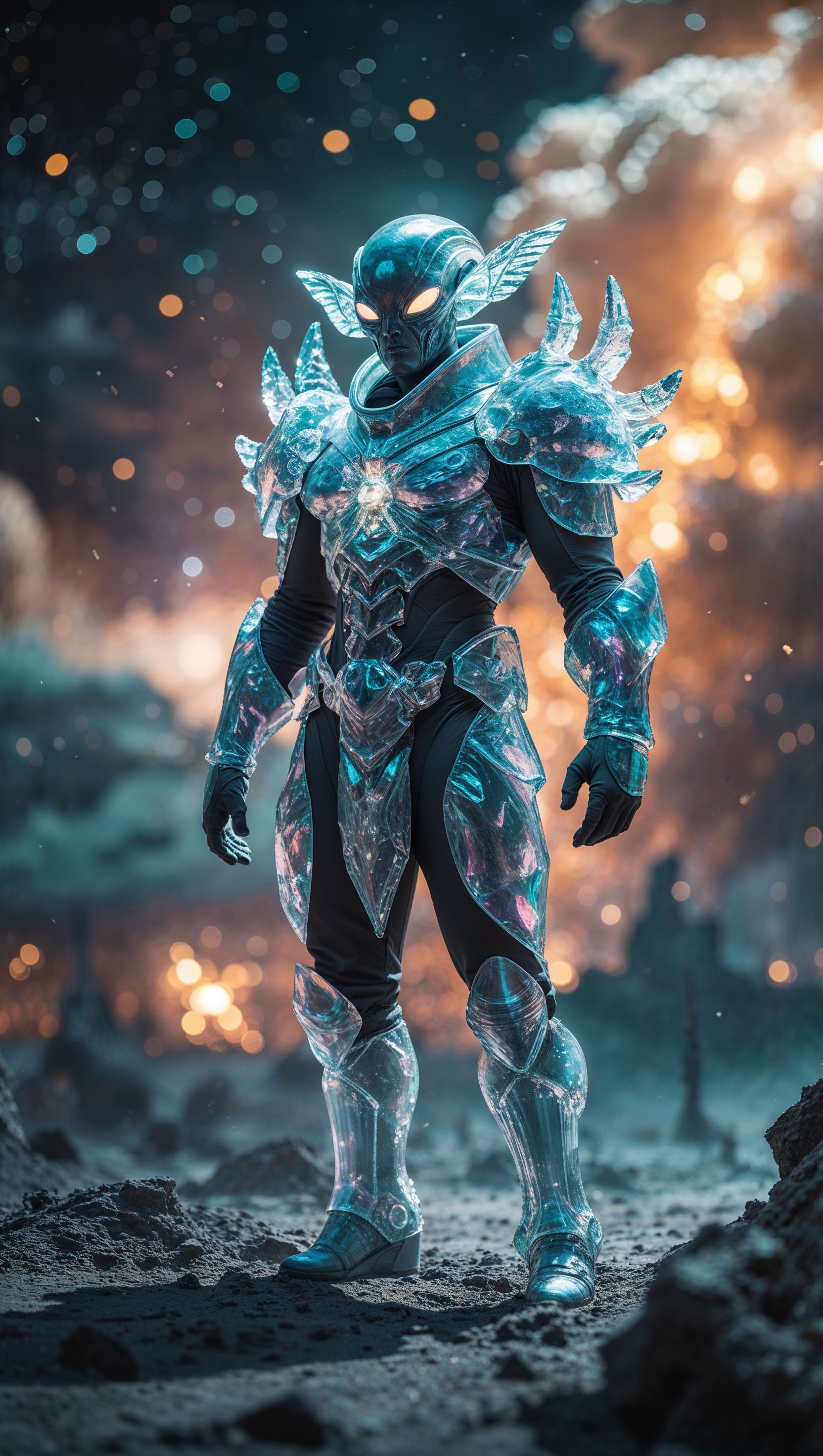 1664x2944 An invincible alien warrior with crystal armor, cosmic battlefield – 4K iPhone