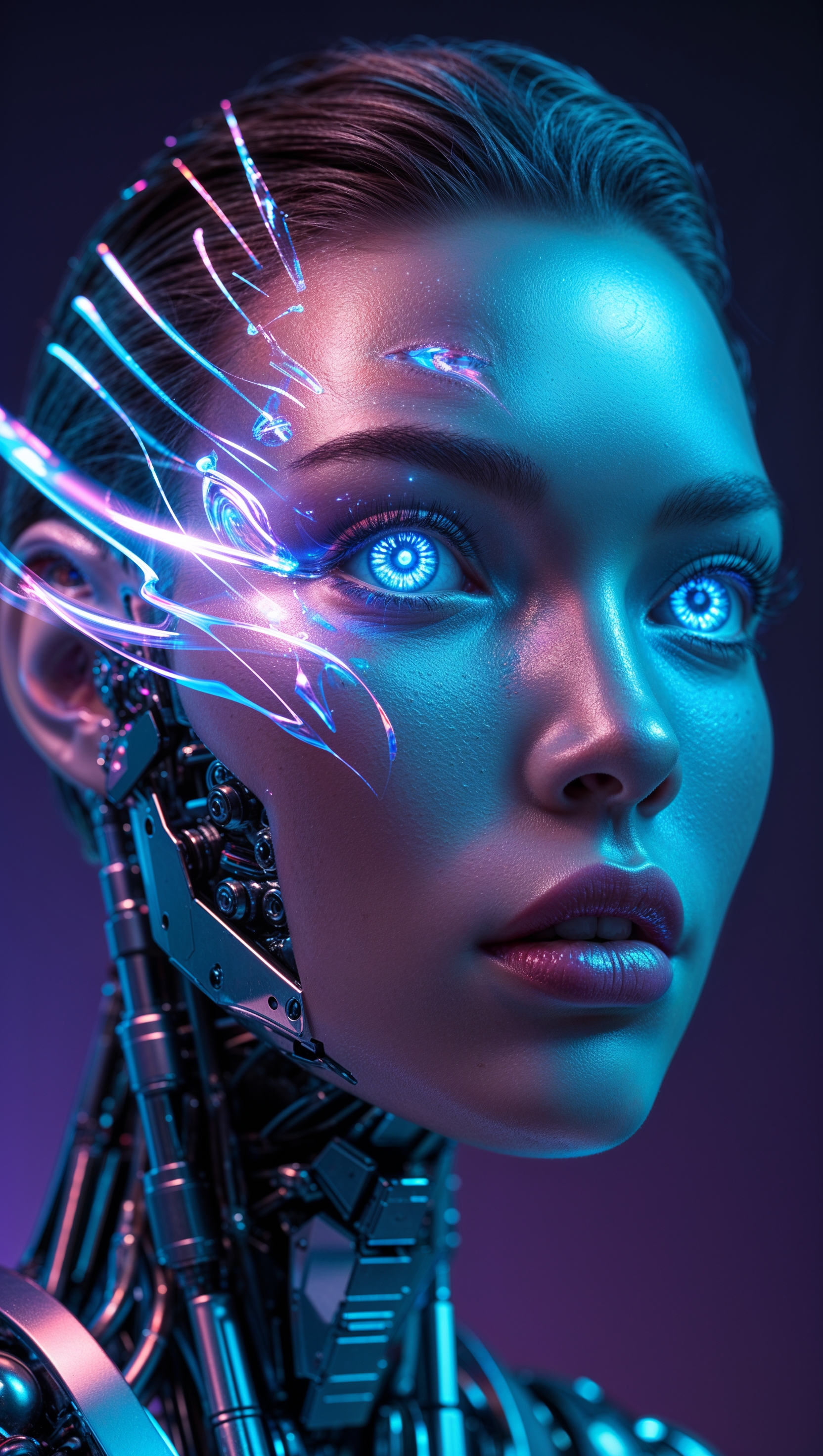 1664x2944 A half-human, half-robot face, invincible with holographic lights – 4K iPhone