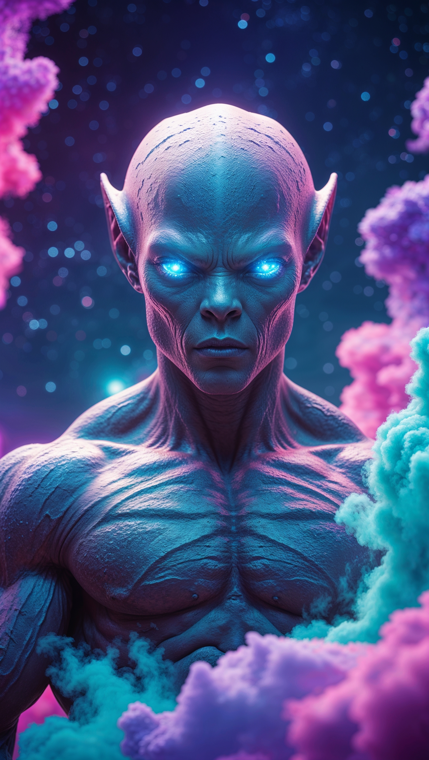 1664x2944 An invincible alien with glowing eyes, bright galaxy behind – 4K iPhone