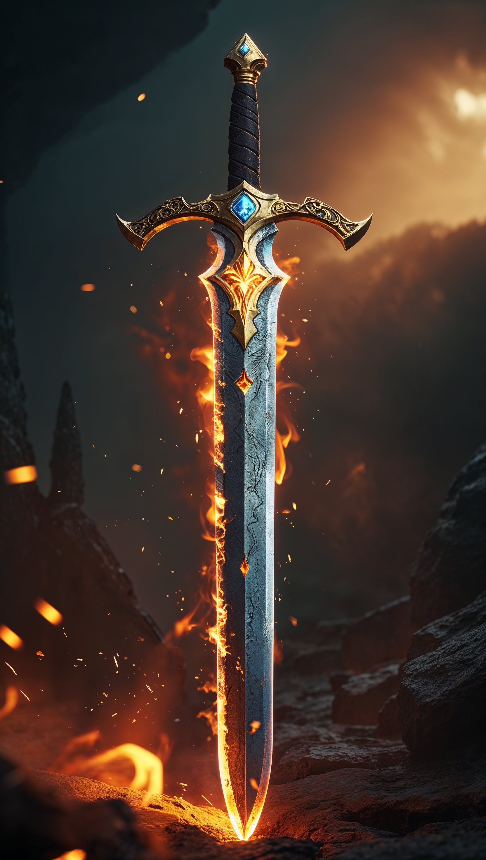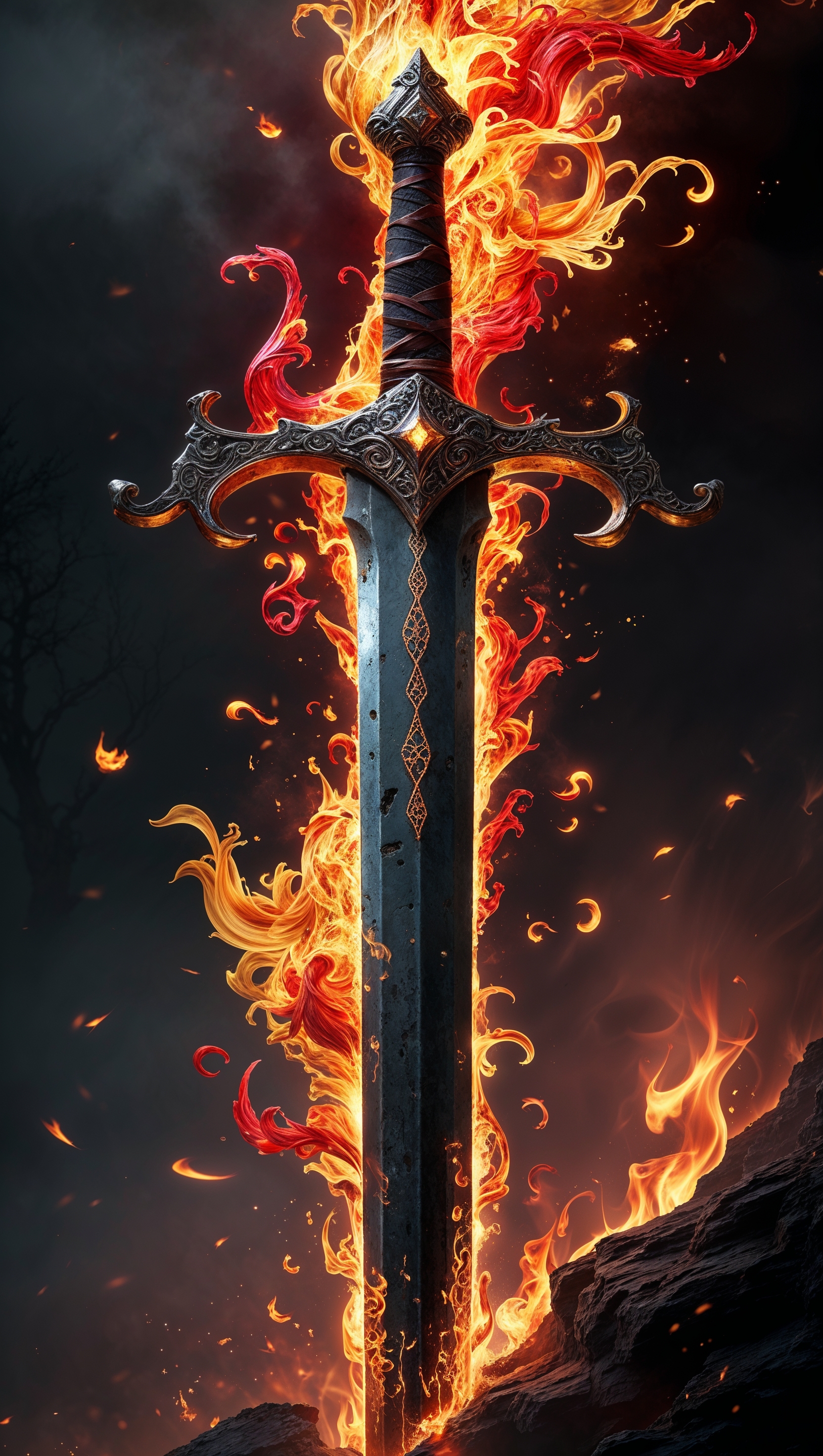 Mystic flames surrounding a sword in Elden Ring style, wallpaper format 1664x2944 Mystic flames surrounding a sword in Elden Ring style, wallpaper format