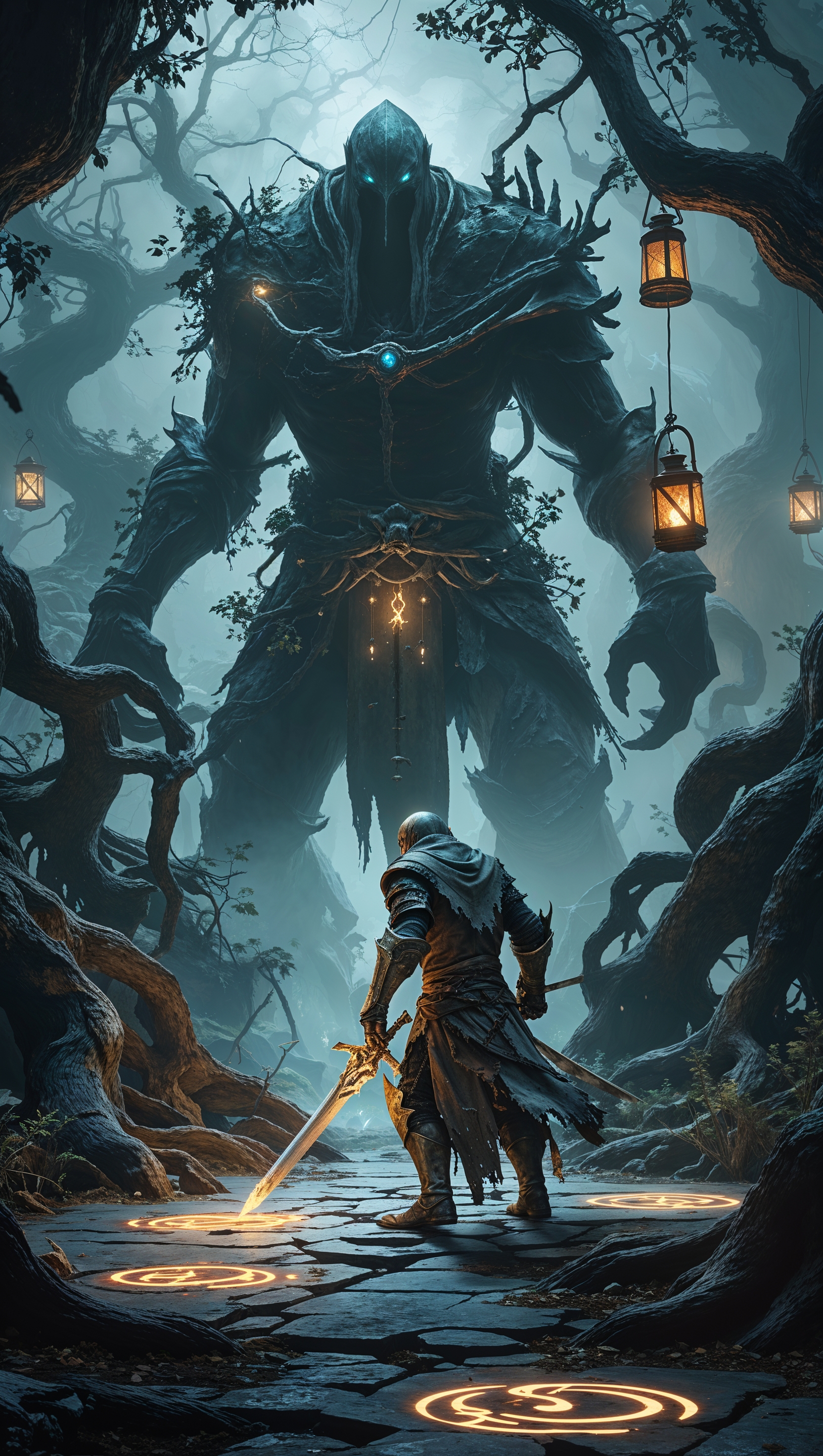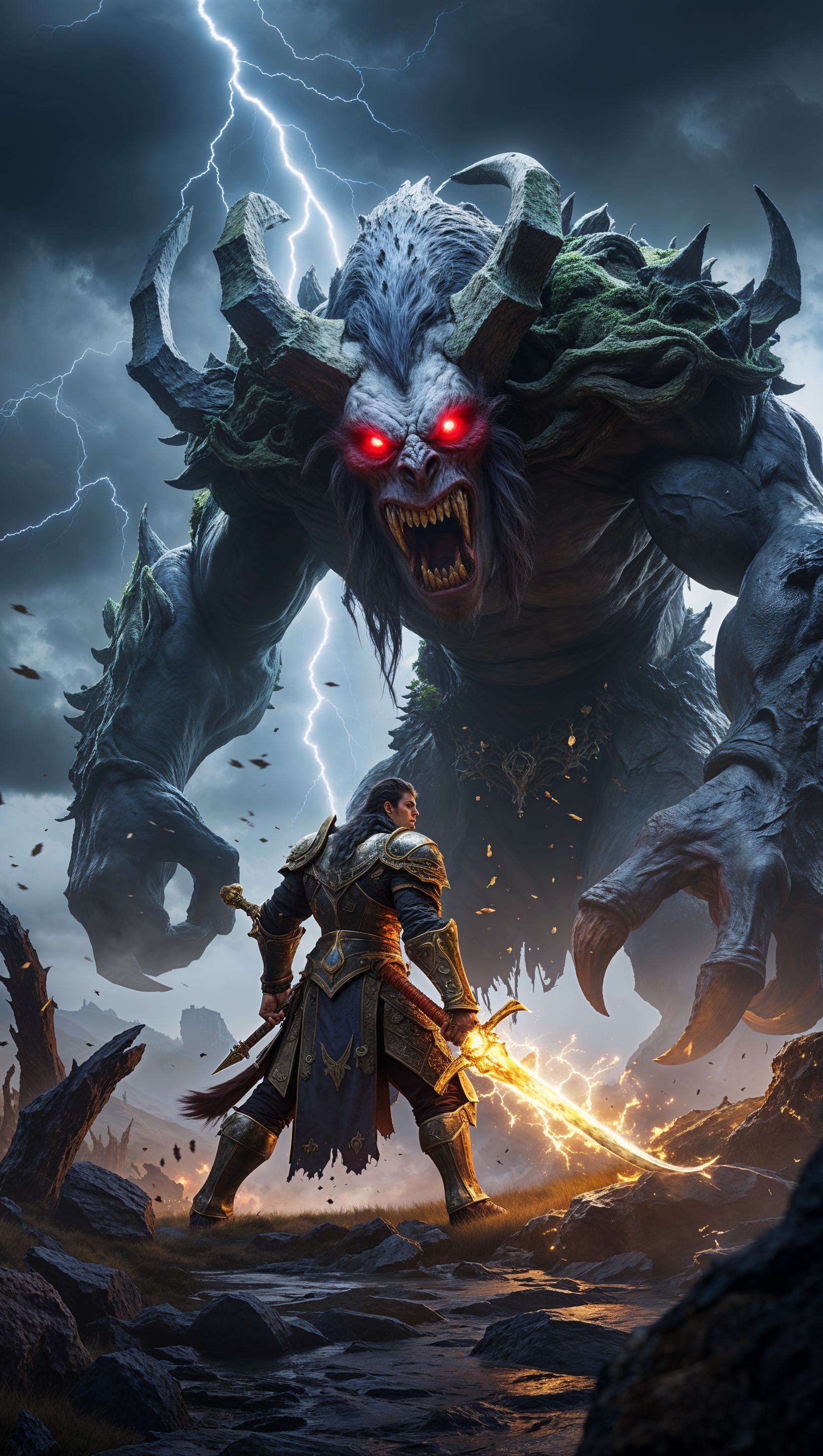 A warrior facing a giant monster from Elden Ring, epic battle 1664x2944 A warrior facing a giant monster from Elden Ring, epic battle