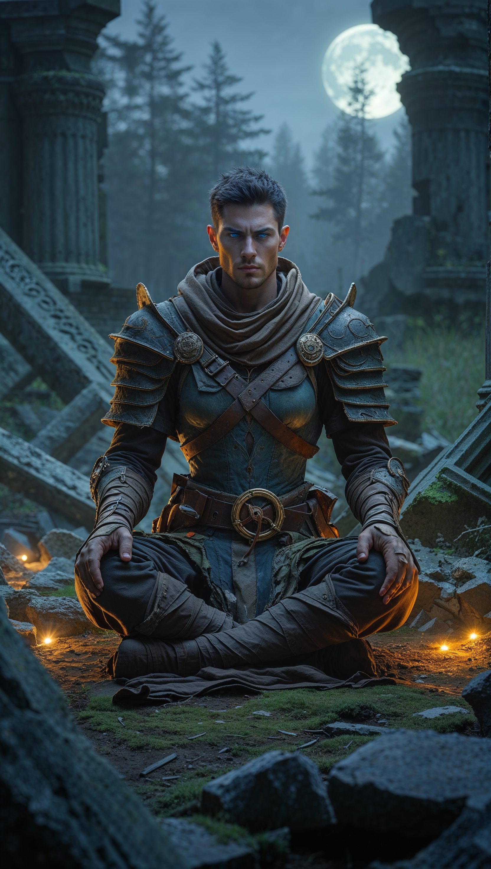 Elden Ring warrior meditating near glowing ruins 1664x2944 Elden Ring warrior meditating near glowing ruins