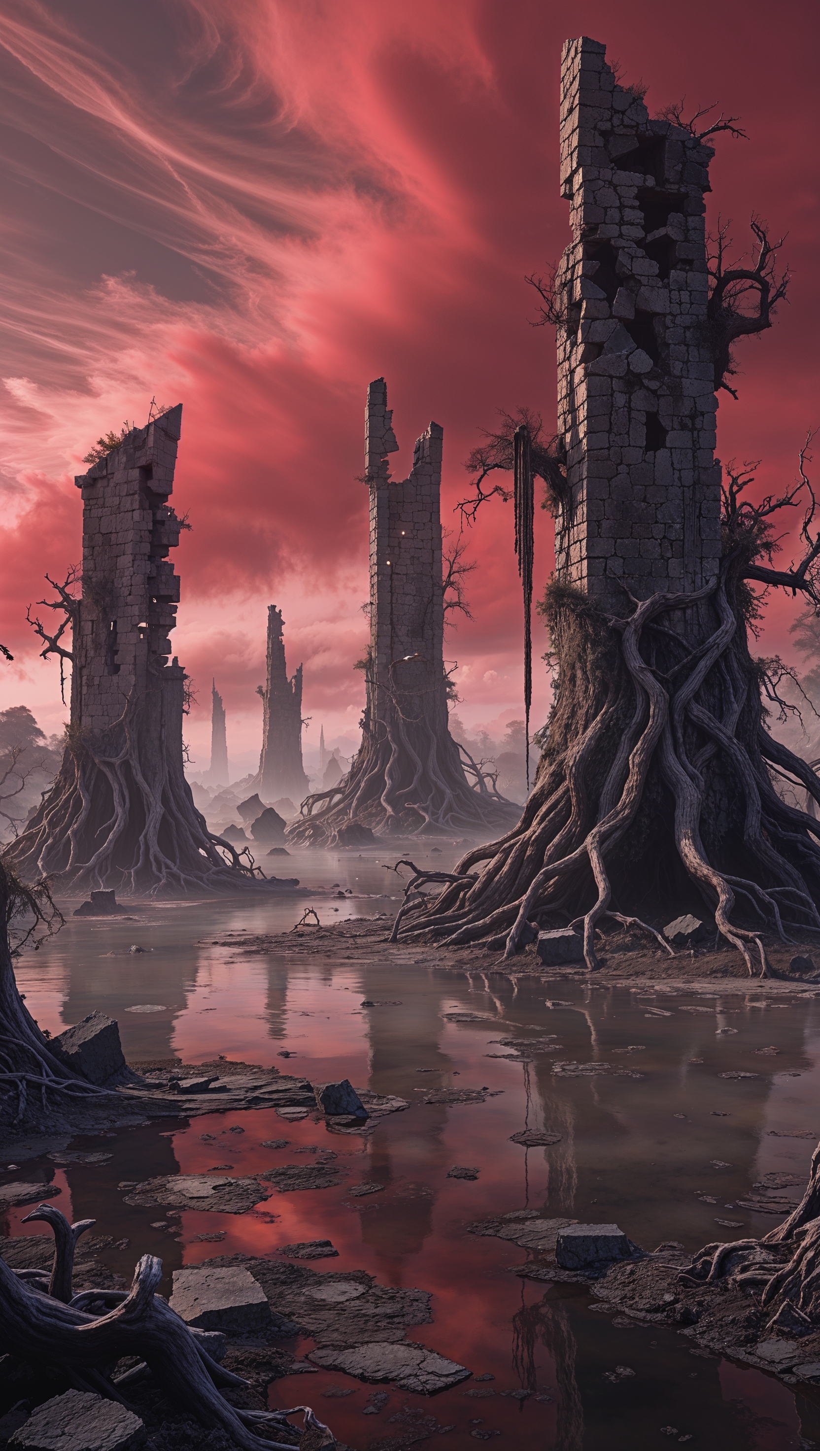 Elden Ring landscape with broken towers and a crimson sky 1664x2944 Elden Ring landscape with broken towers and a crimson sky