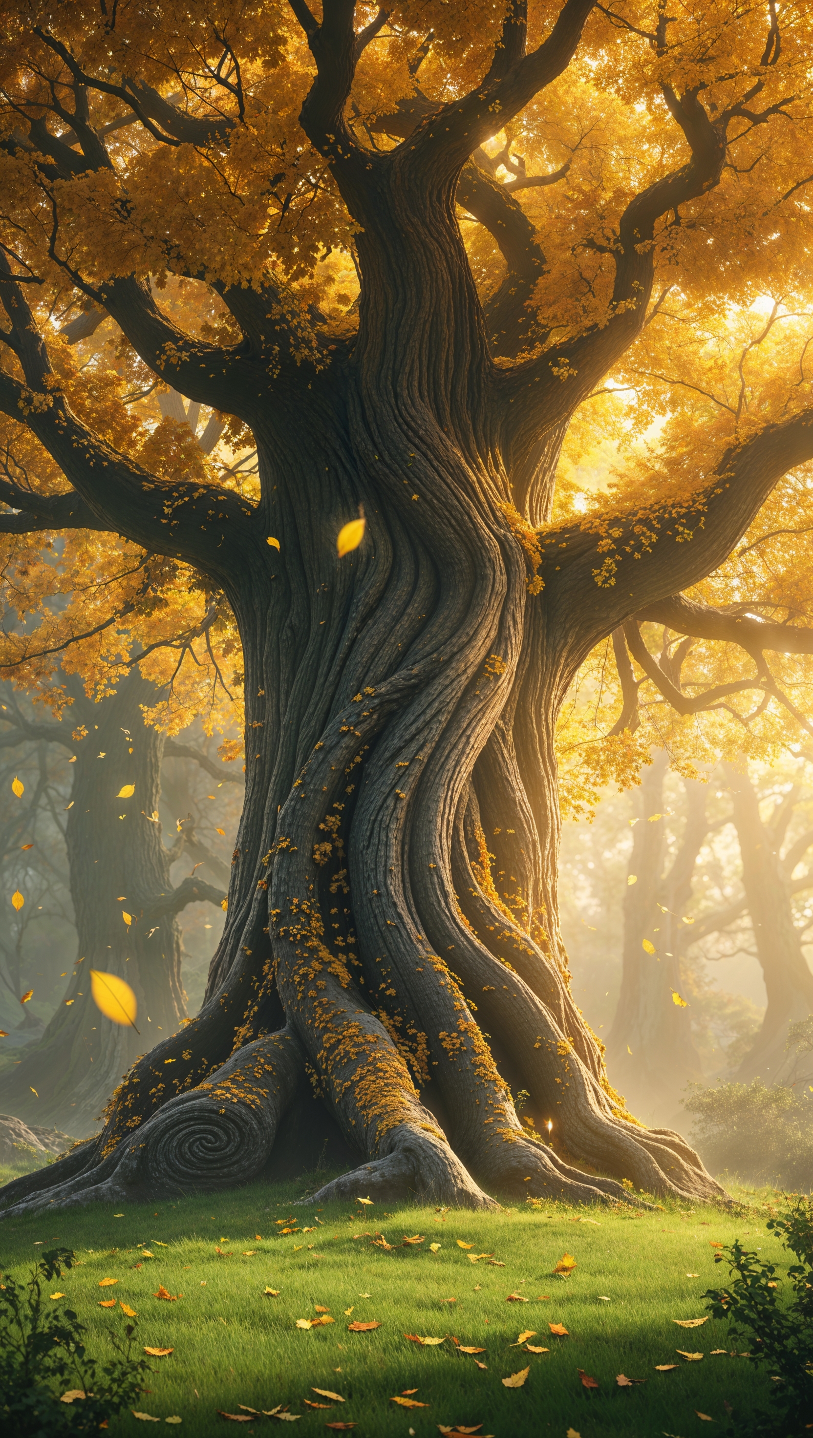 Sacred tree of Elden Ring with golden leaves falling, peaceful vibe 1664x2944 Sacred tree of Elden Ring with golden leaves falling, peaceful vibe