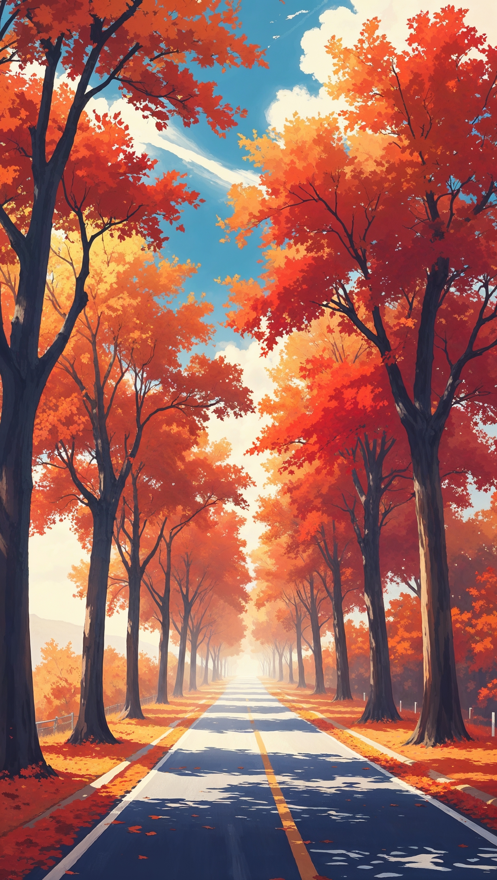 1664x2944 A vertical wallpaper of a tree-lined road covered in orange and red leaves