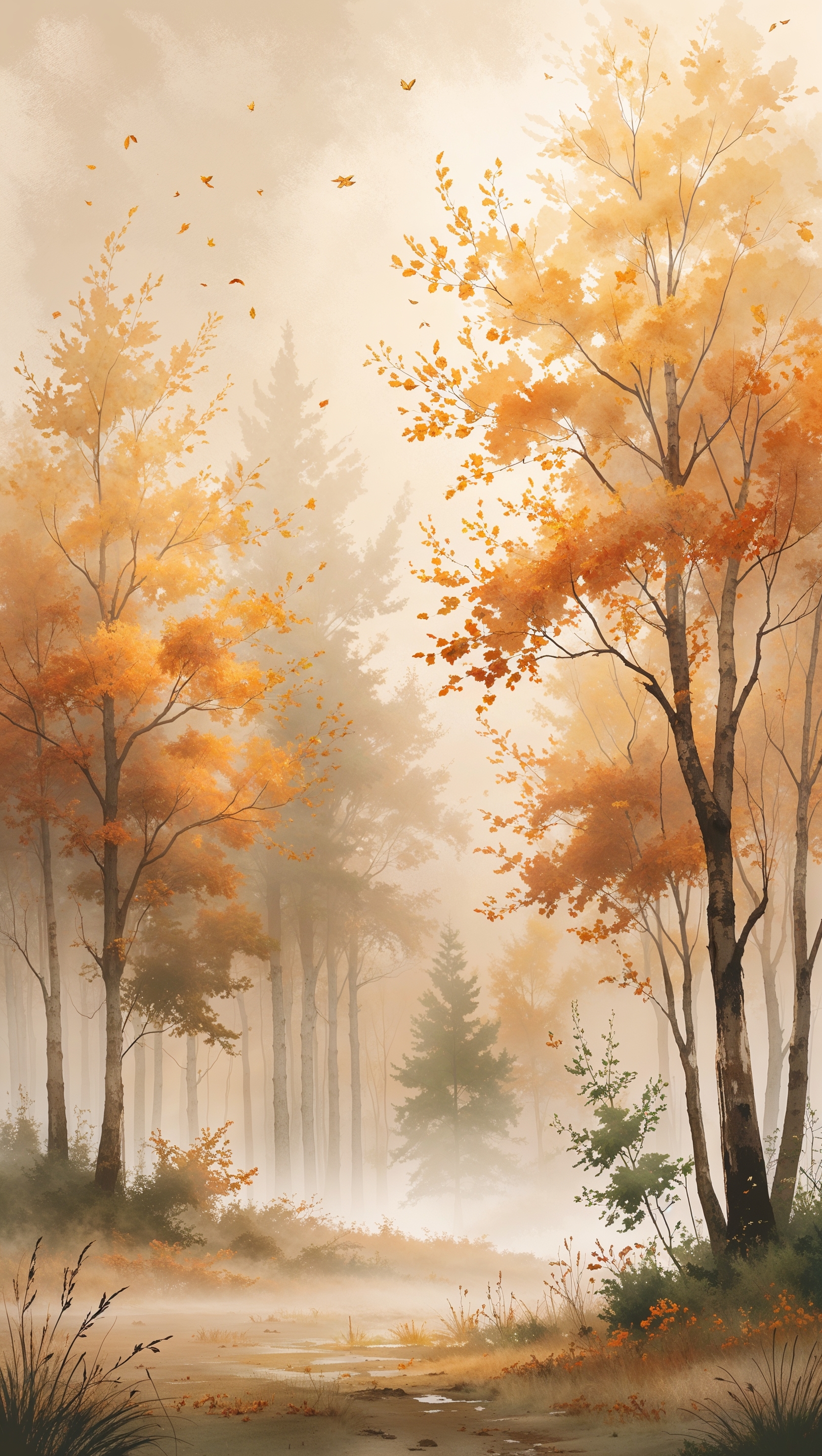 1664x2944 Soft watercolor-style autumn scenery with golden trees and light fog