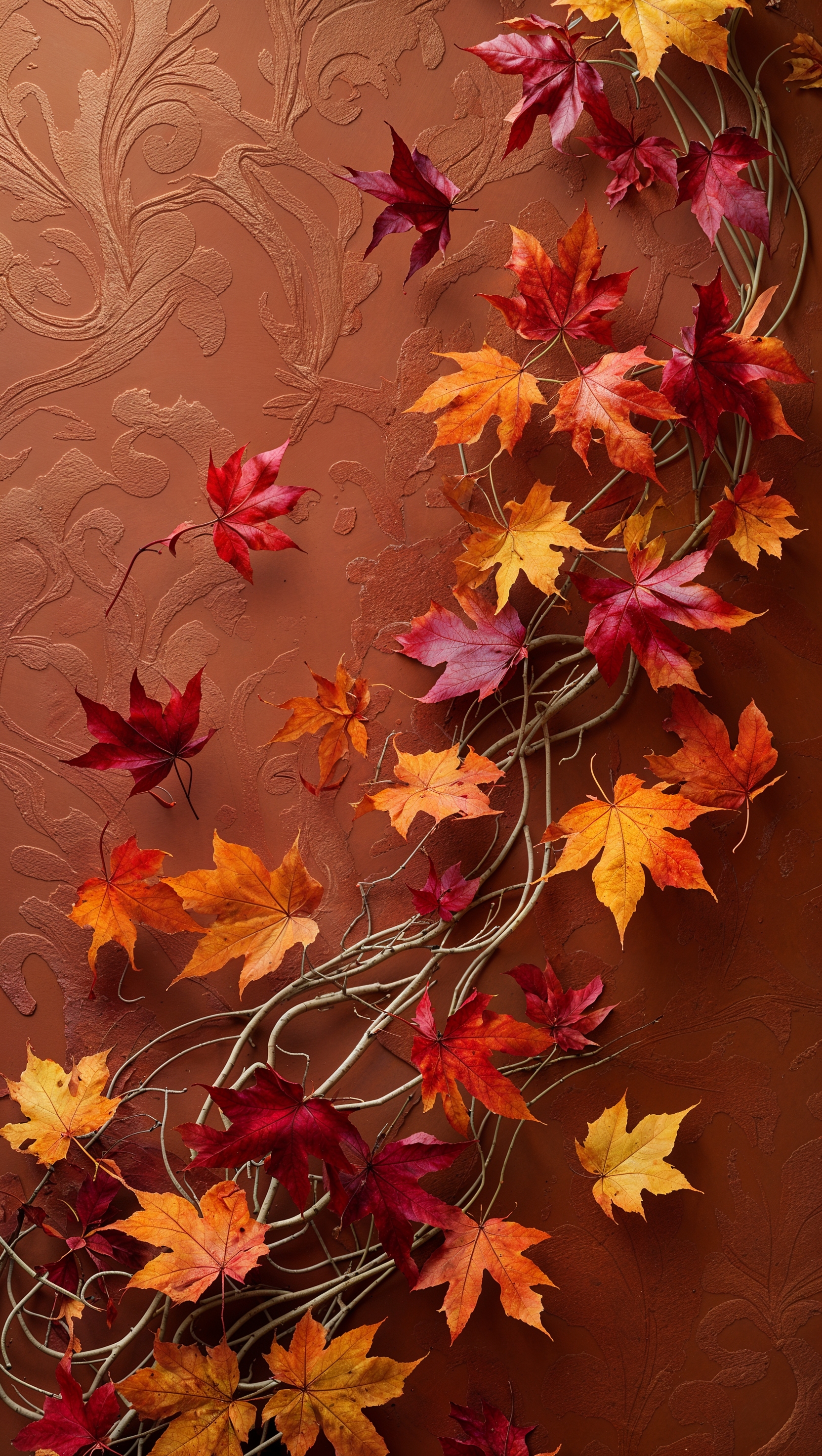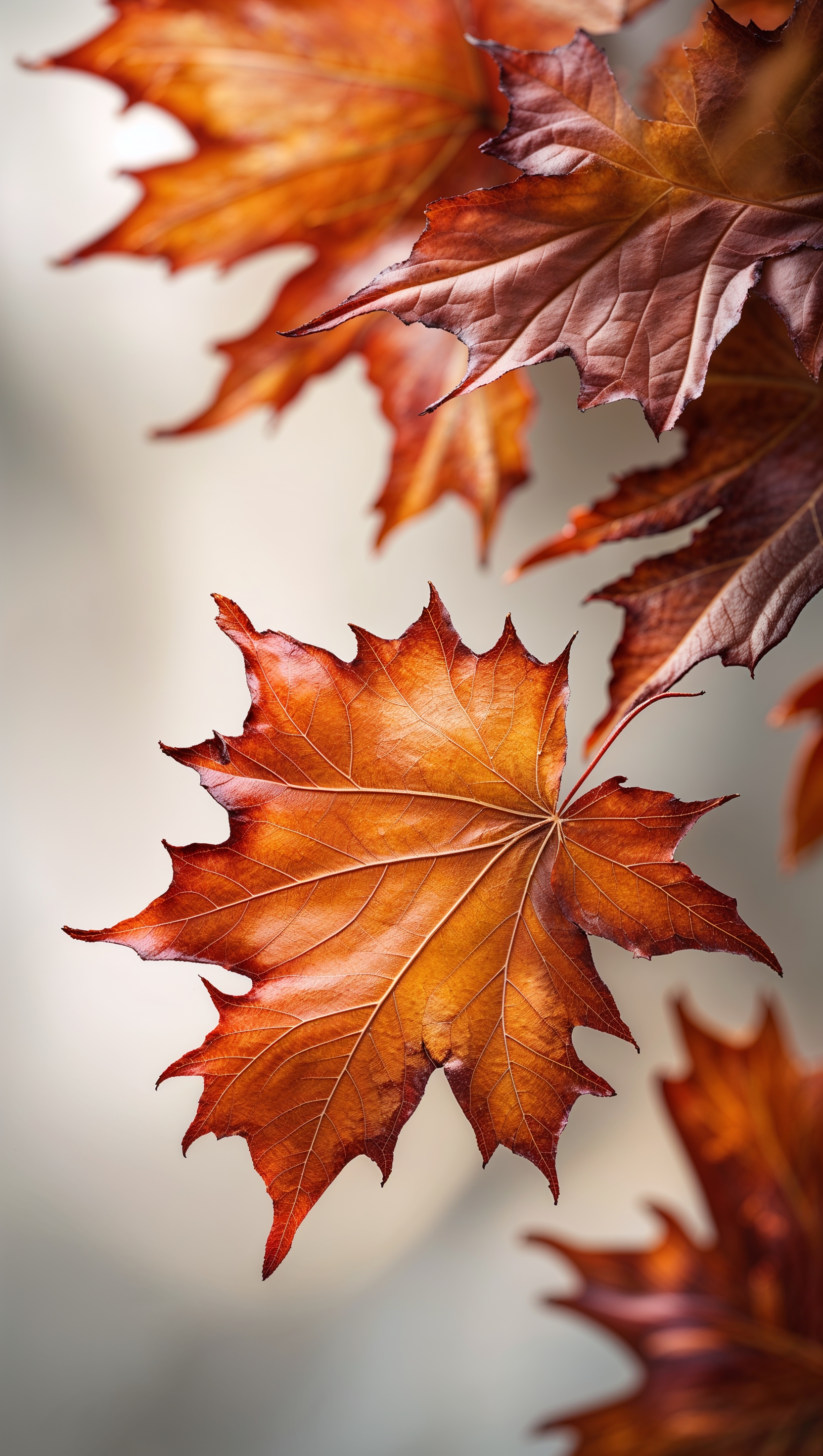 1664x2944 Close-up of maple leaves in deep orange and brown tones, soft depth of field