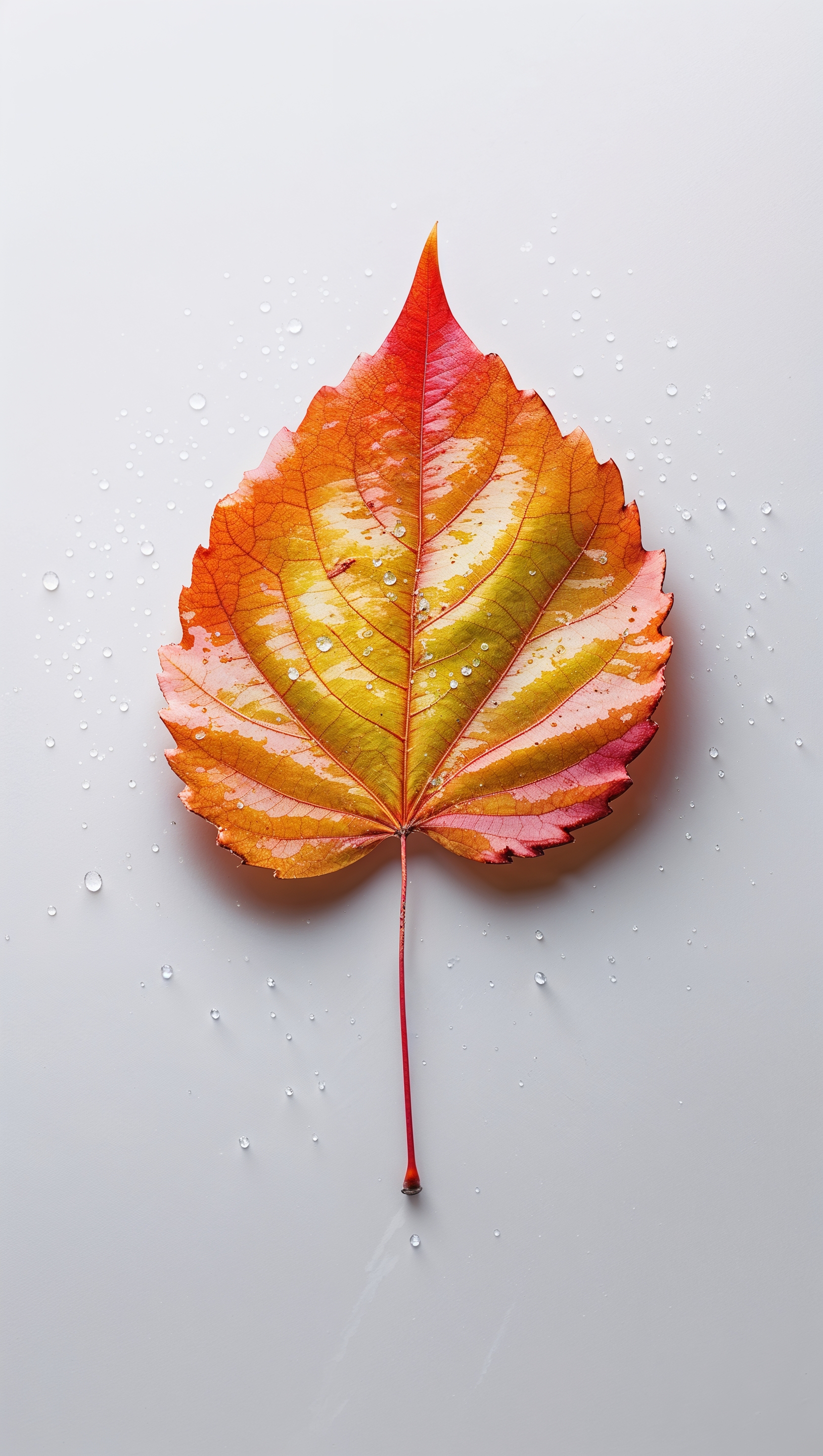 1664x2944 High-detail macro shot of a single dewy autumn leaf, centered on white