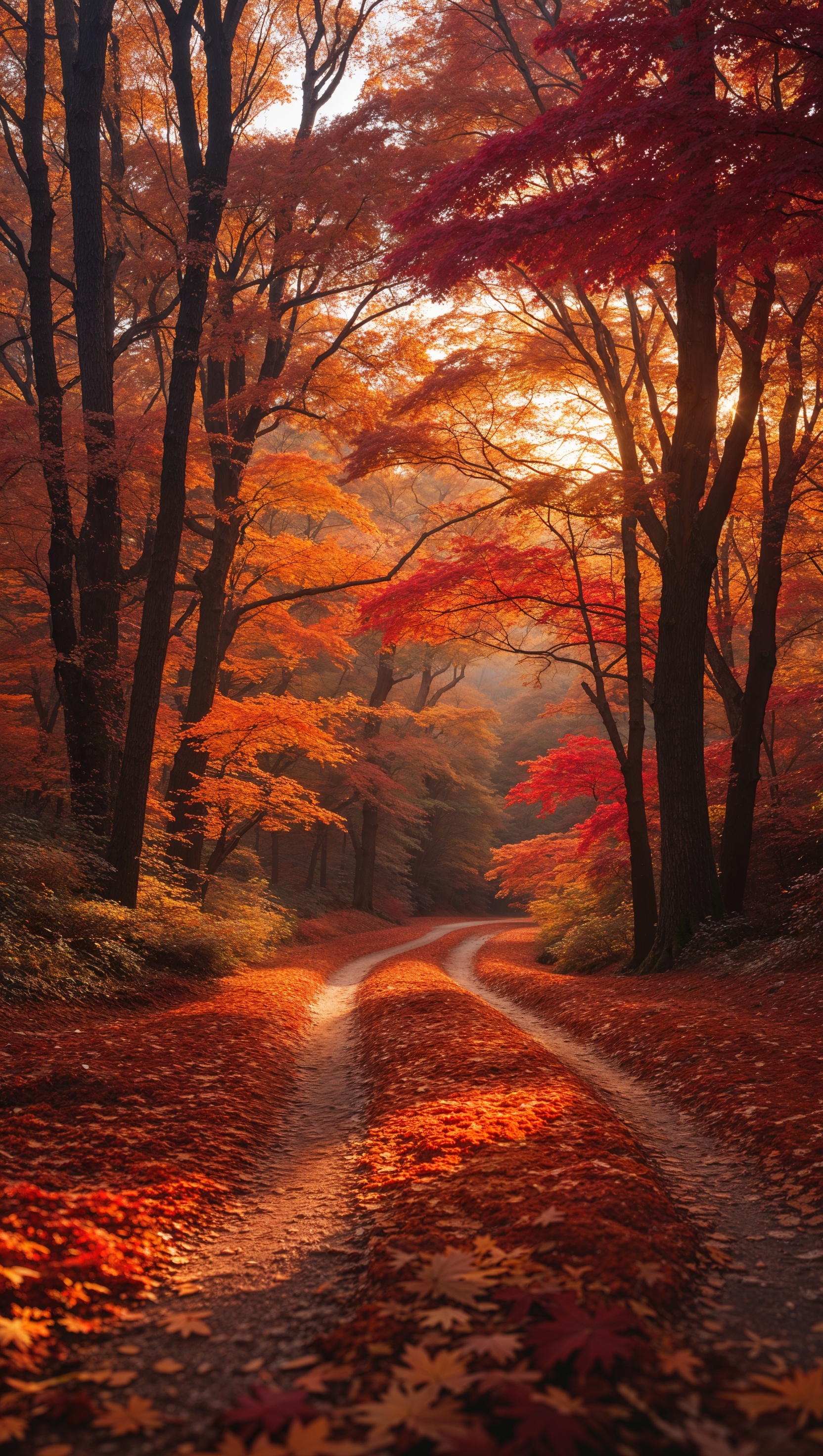 1664x2944 Golden hour autumn forest path with warm tones and leaf carpet