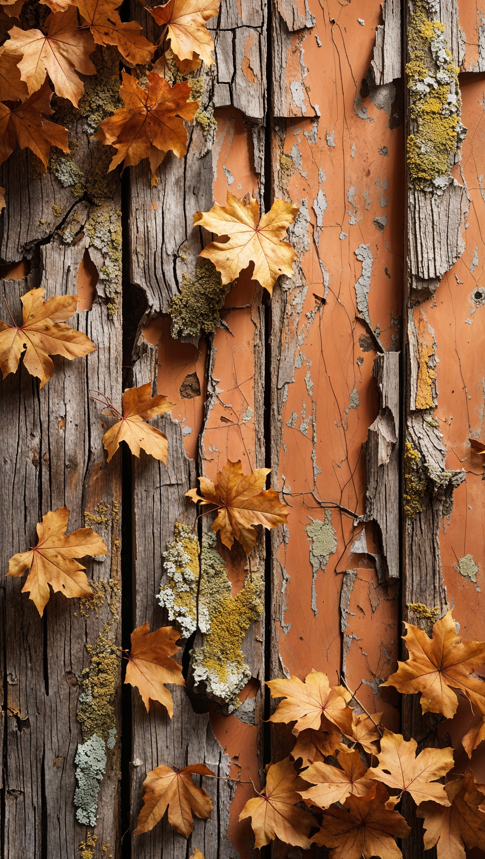 1664x2944 Rustic autumn background with old wooden textures and faded leaves