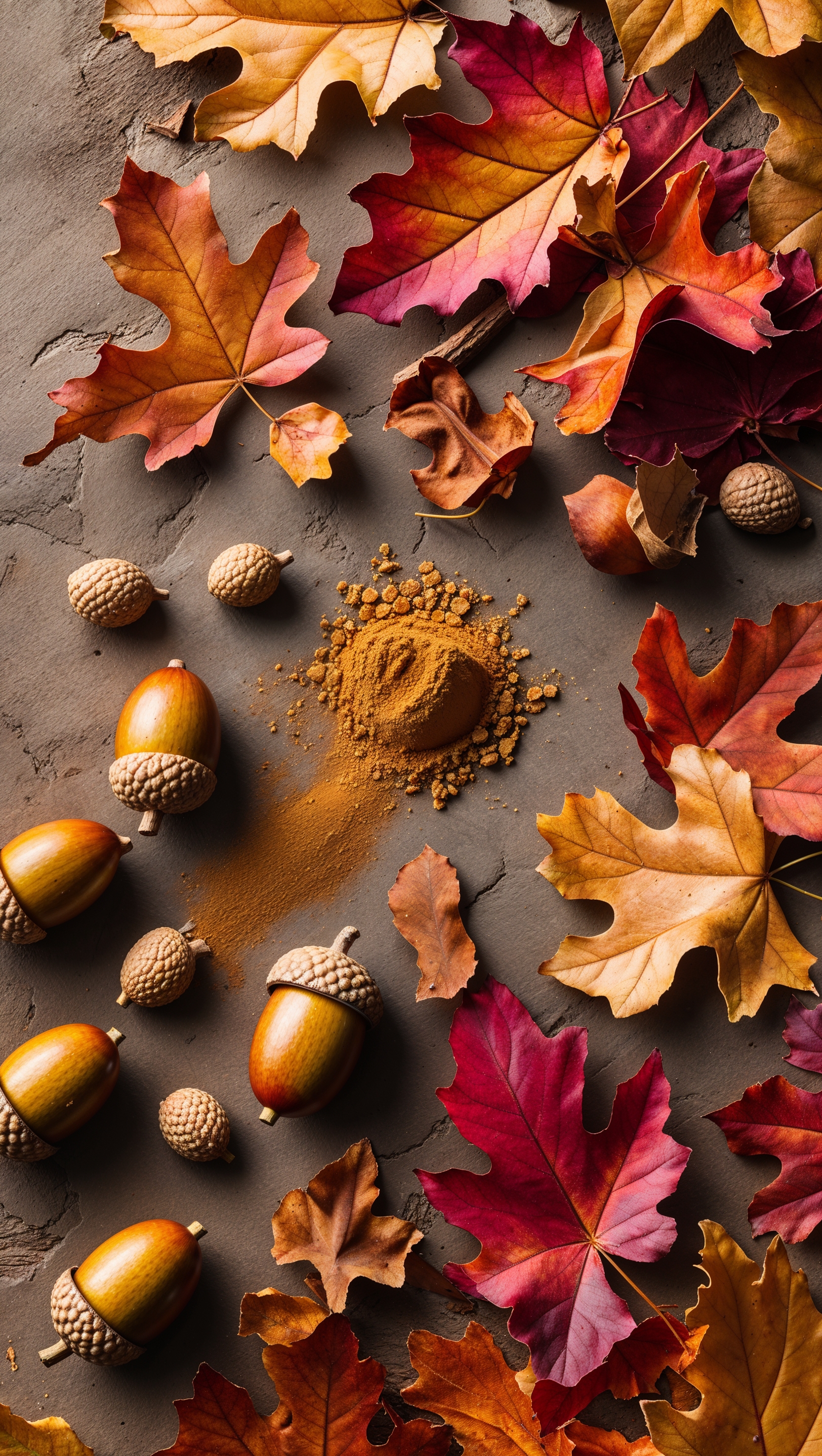 1664x2944 Flat lay composition of autumn objects: acorns, dried leaves, cinnamon, cozy vibe