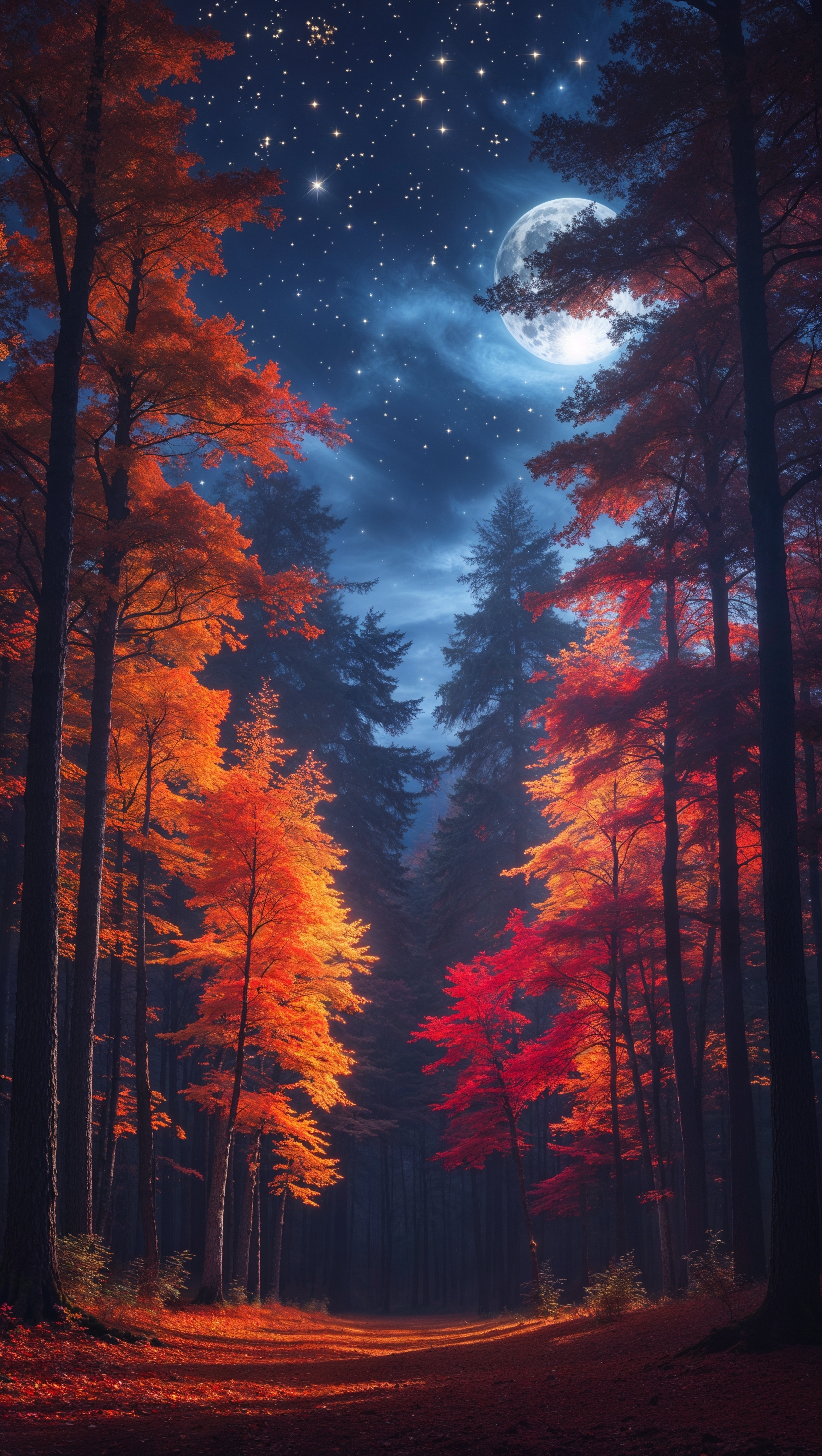1664x2944 Autumn night scene with glowing stars above a forest of red-orange trees