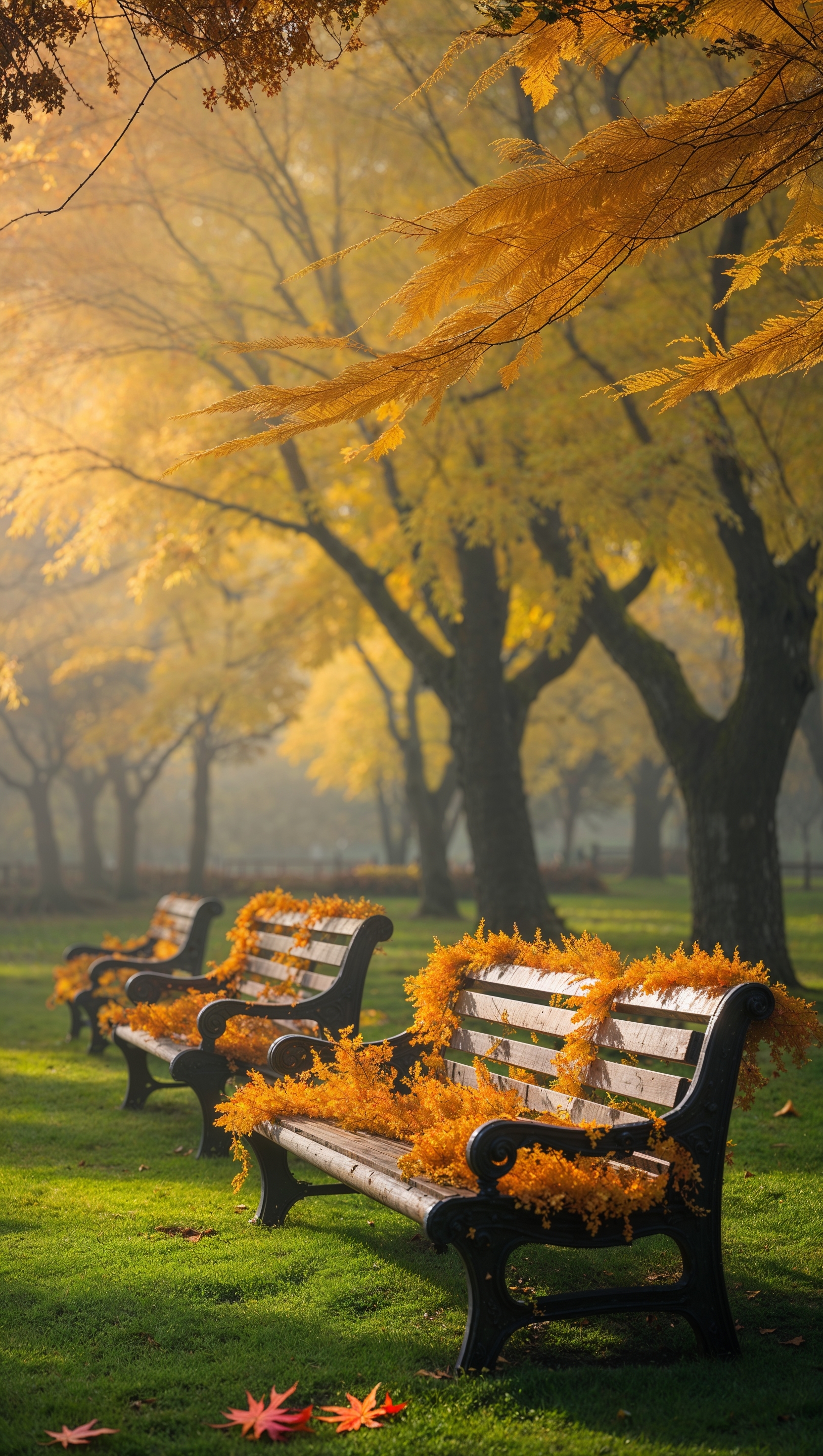 1664x2944 Peaceful autumn park with benches, yellow trees, and soft breeze effect