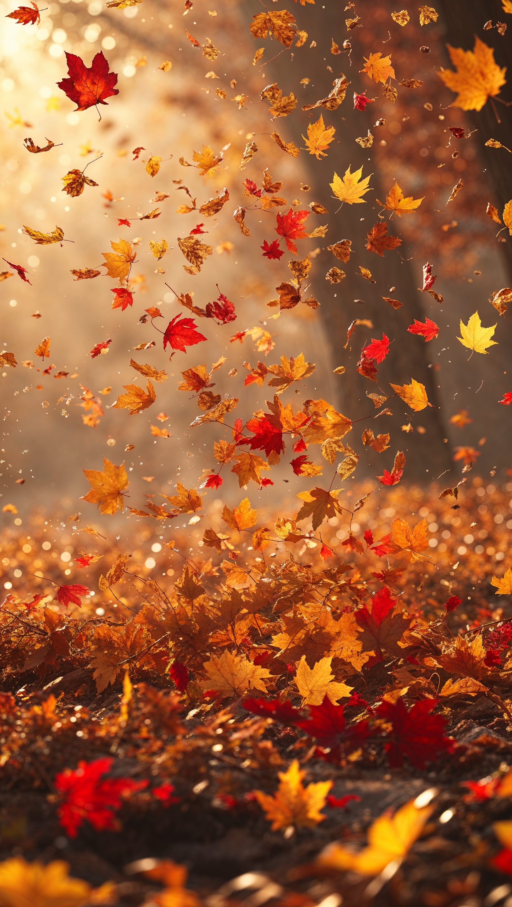1664x2944 Crisp autumn air theme with flying leaves and sunlit haze in background