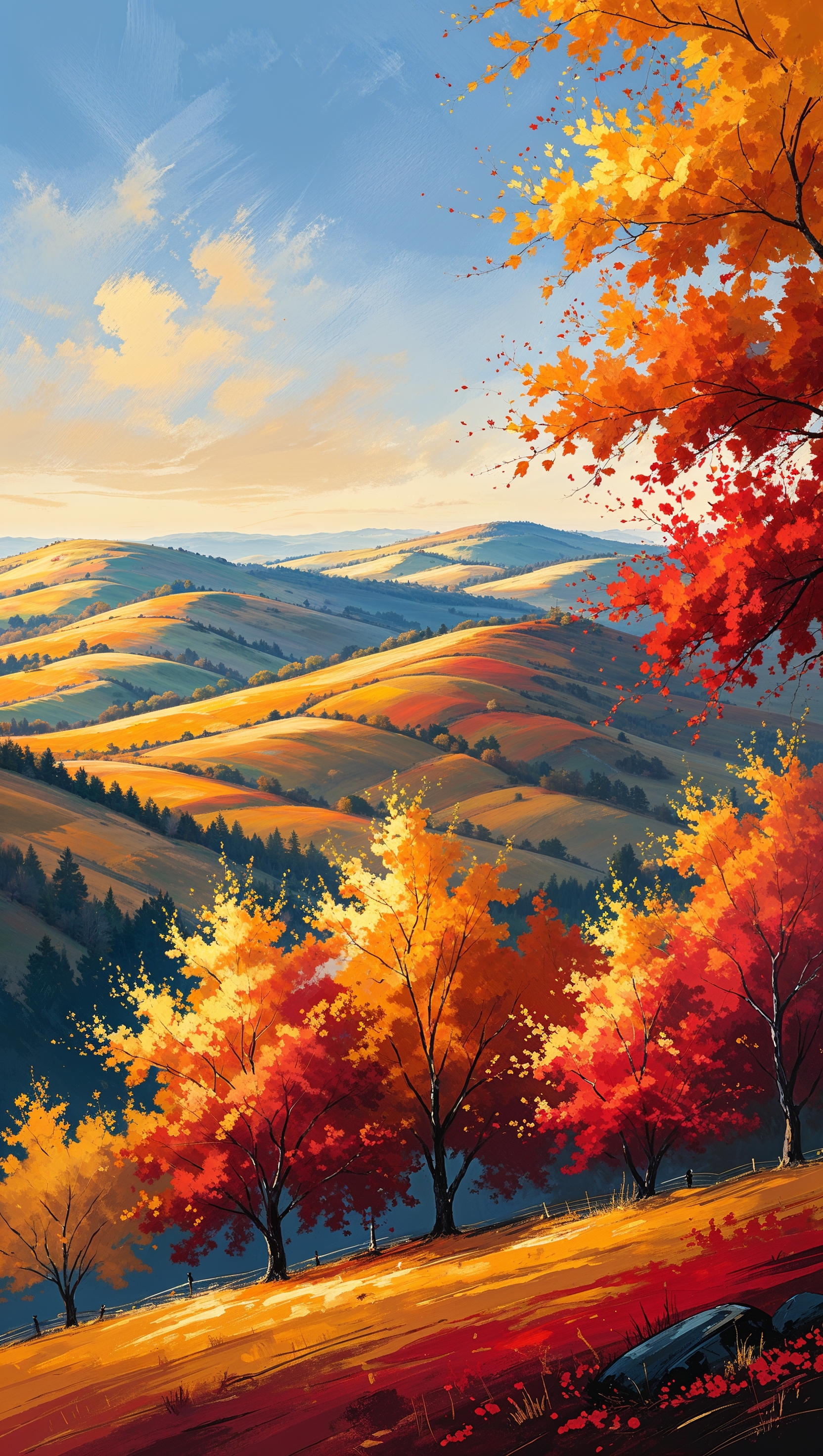 1664x2944 Hand-painted autumn landscape with distant hills and trees in gold-red hues