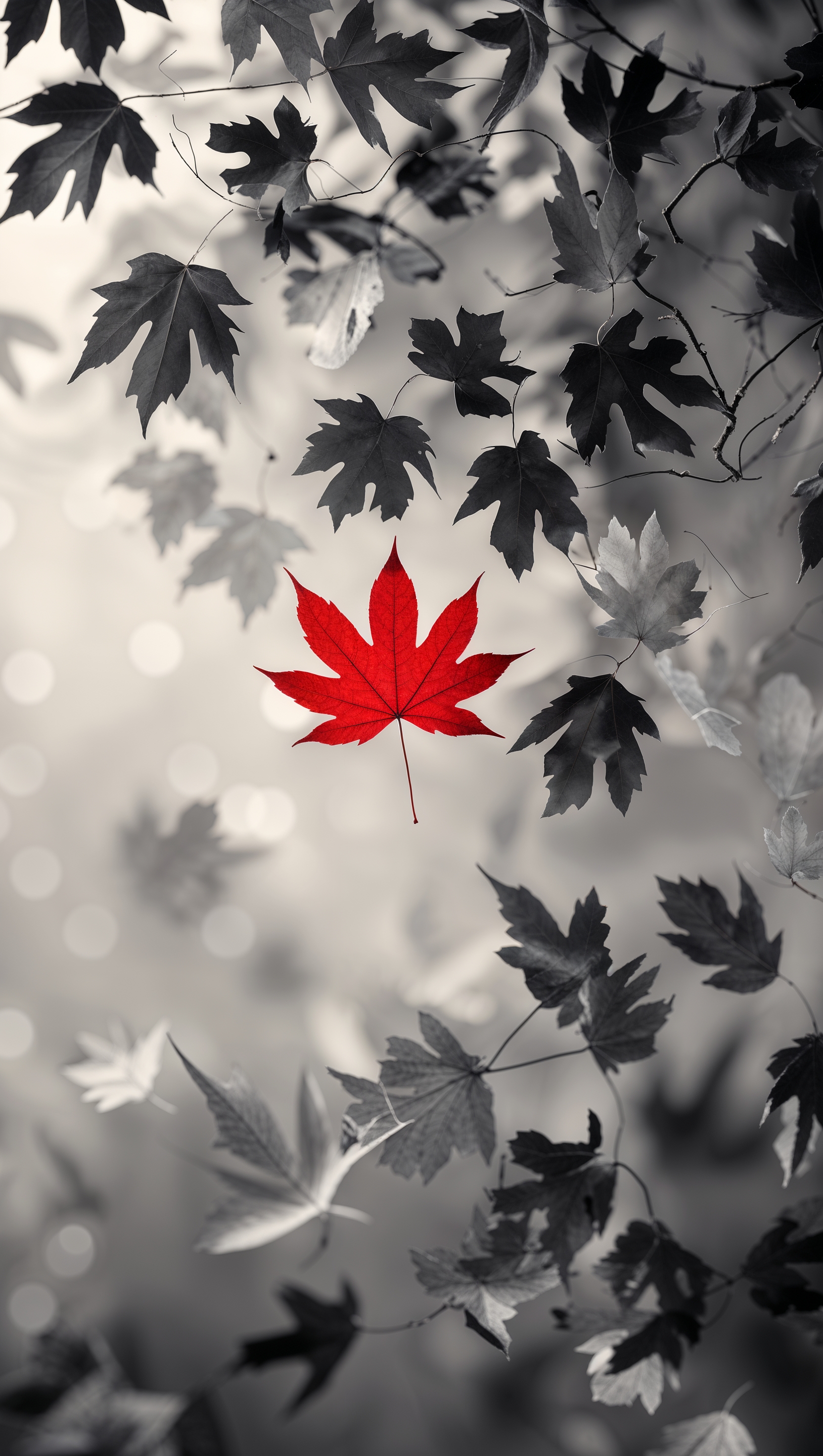 1664x2944 Black and white fall leaves with just one colored red leaf for contrast