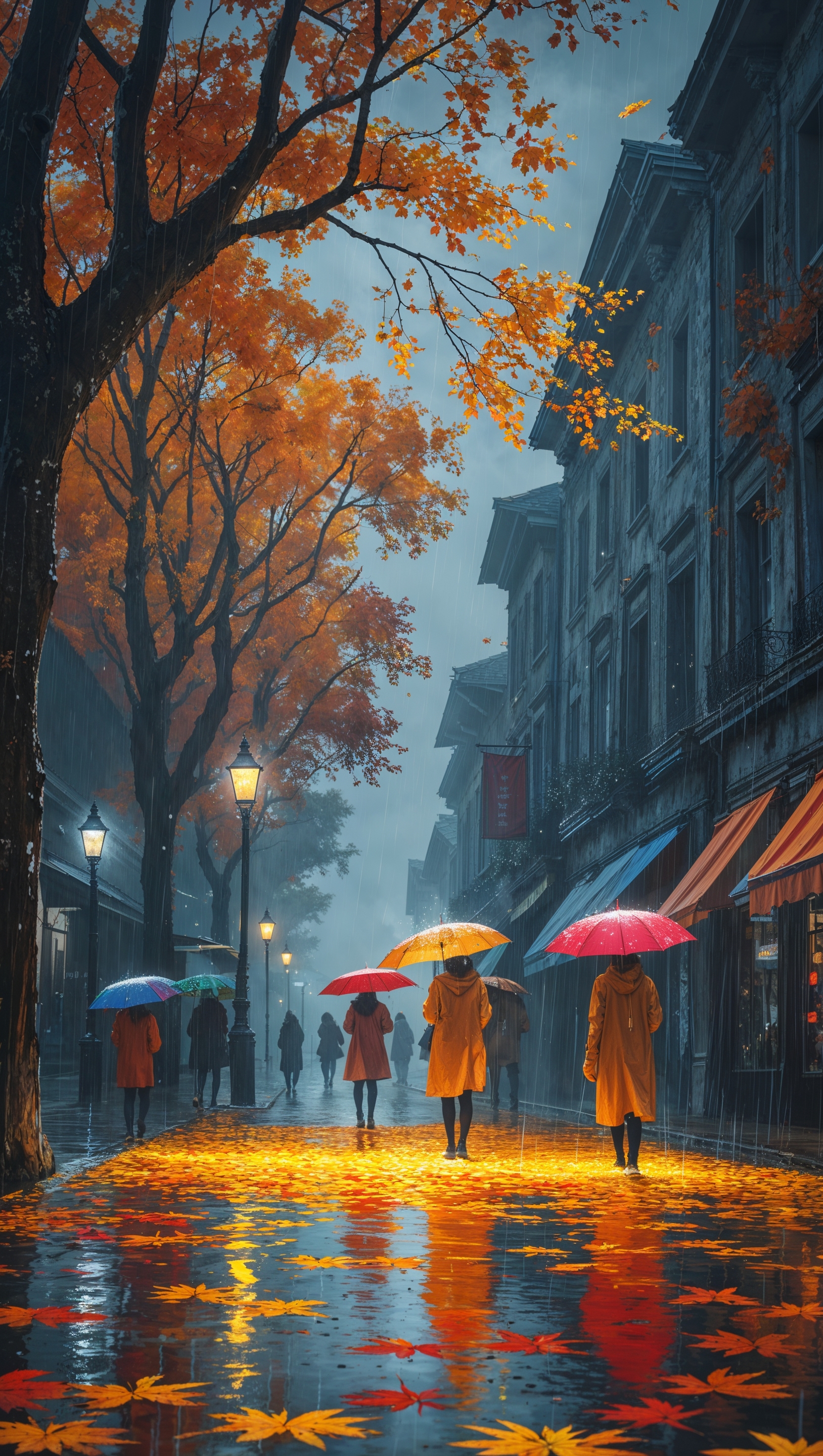 1664x2944 Rainy autumn street scene with yellow leaves and glowing reflections