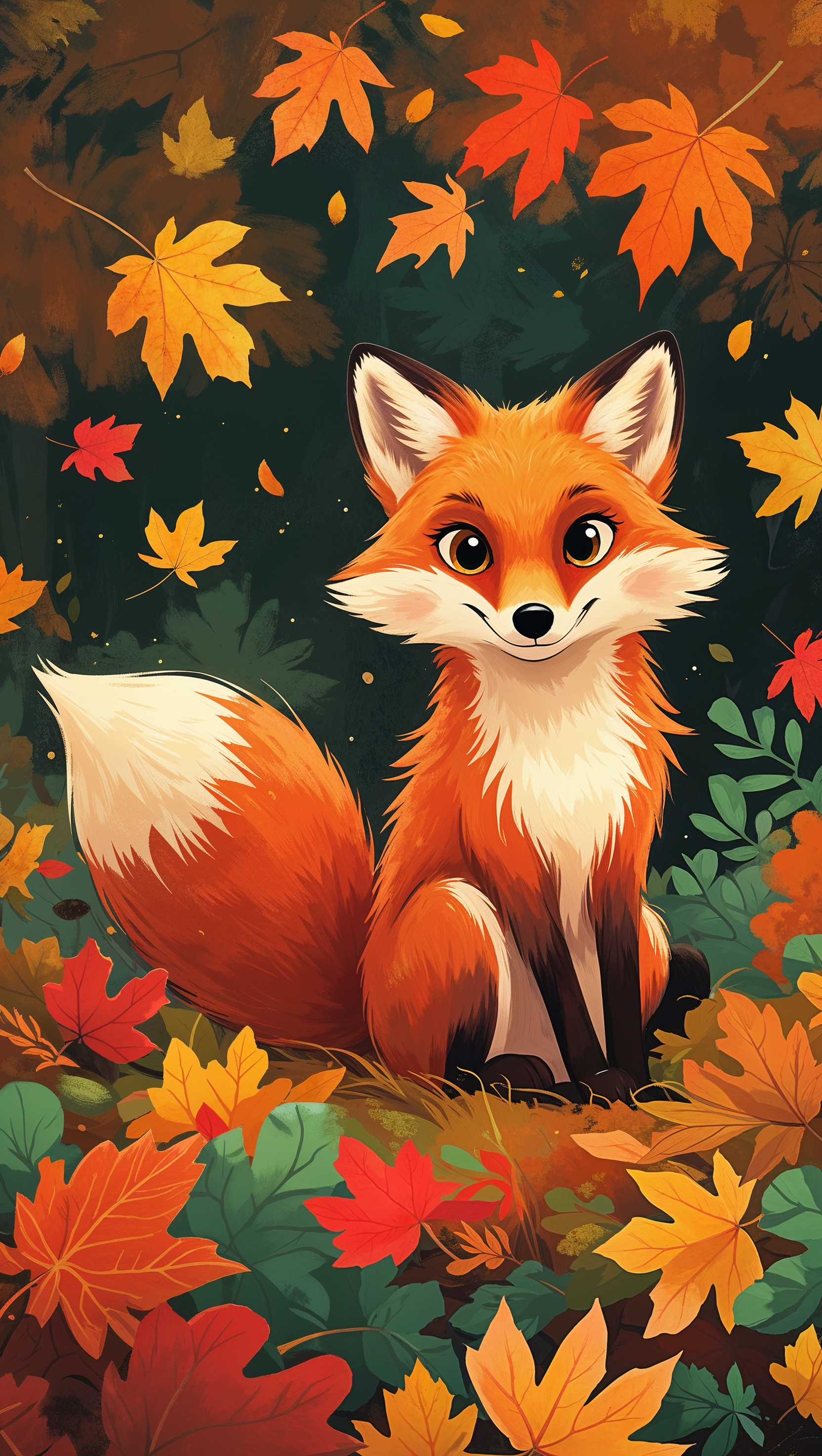 1664x2944 Cute cartoon fox sitting among colorful autumn leaves, soft textured style