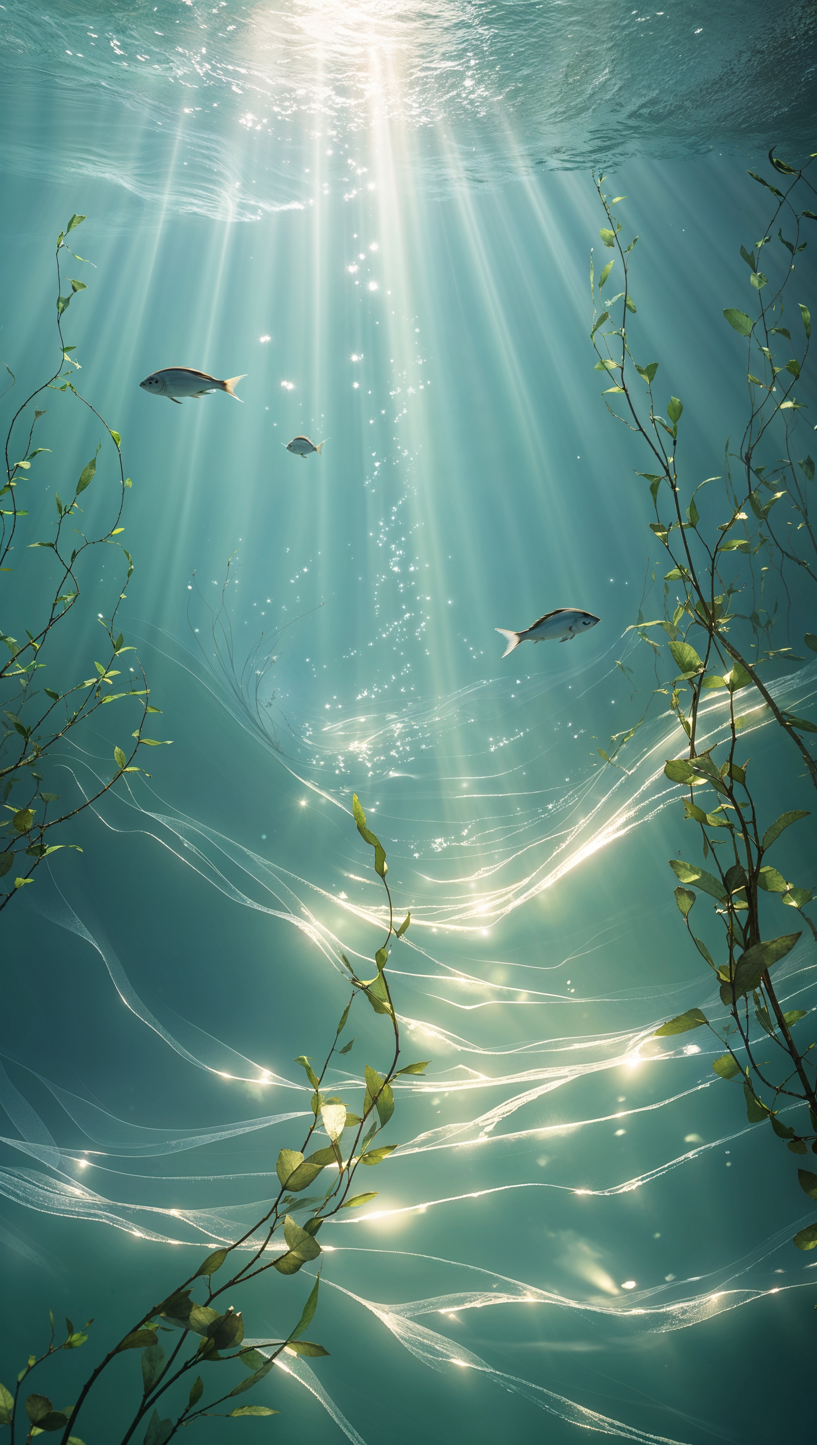 Underwater scene with rays of light shining through the surface, serene and magical 1664x2944 Underwater scene with rays of light shining through the surface, serene and magical