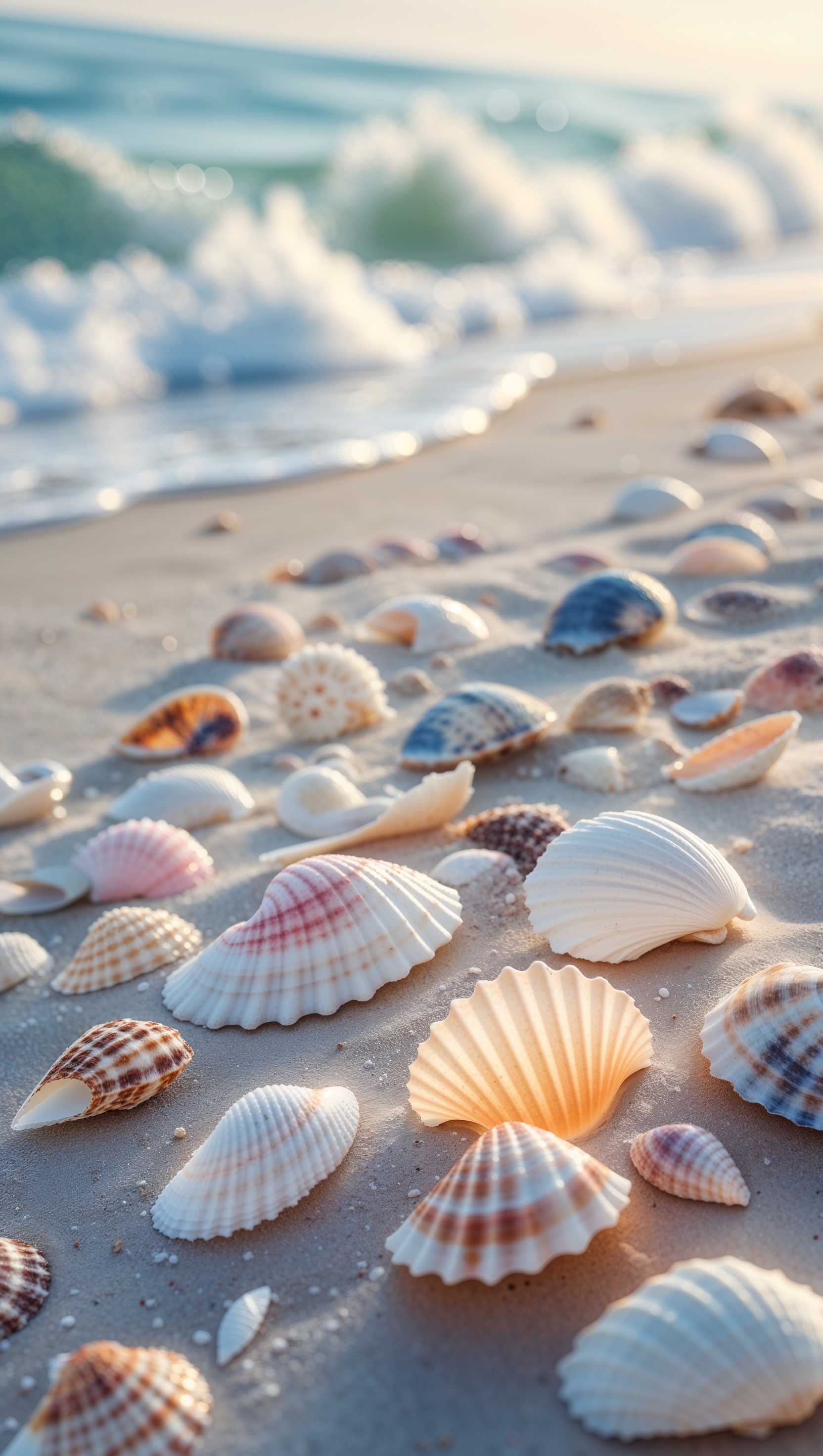 Soft-focus image of seashells on a beach with ocean waves in the background 1664x2944 Soft-focus image of seashells on a beach with ocean waves in the background