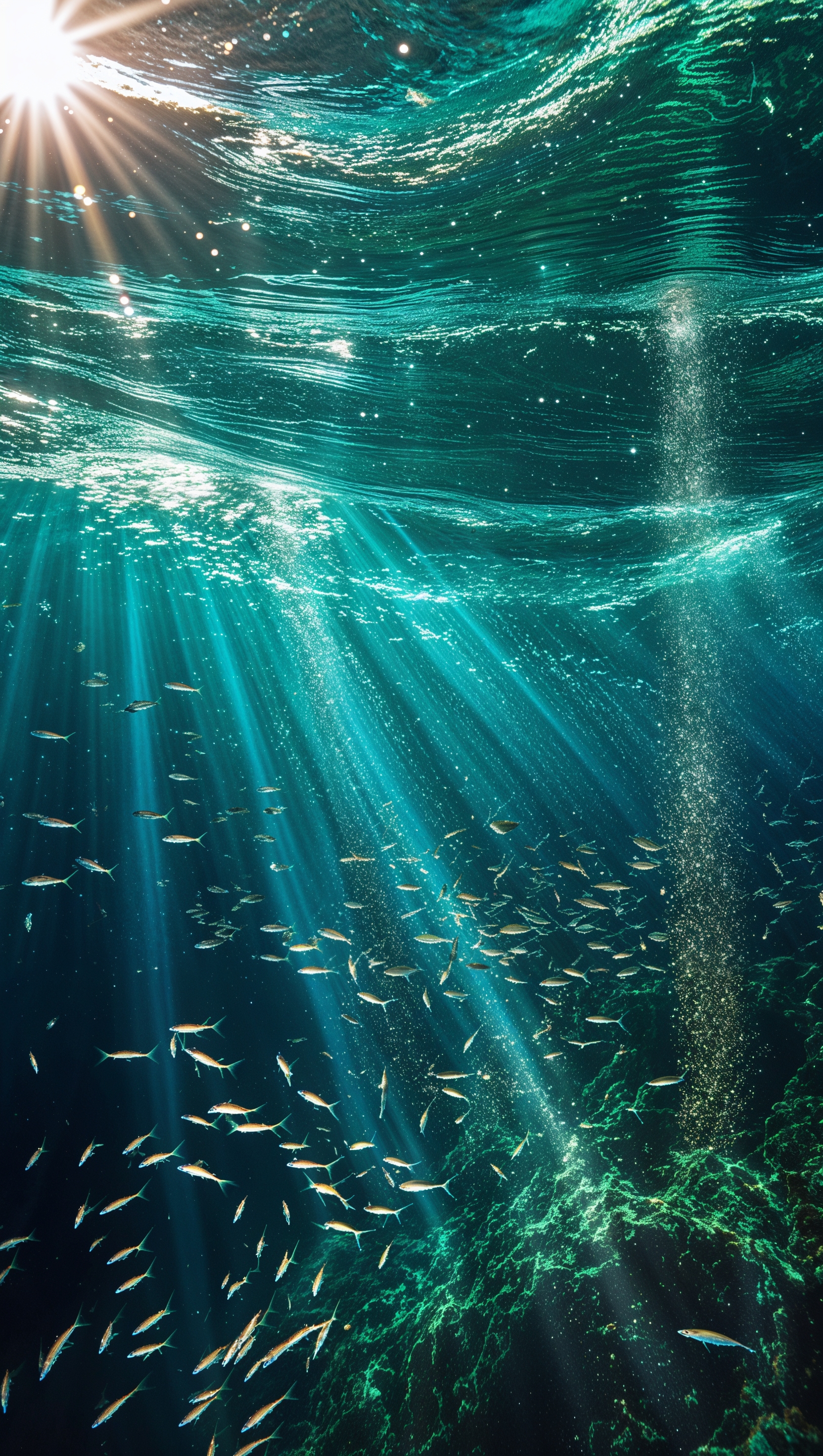 Sunlight piercing through ocean surface in underwater view, glowing particles 1664x2944 Sunlight piercing through ocean surface in underwater view, glowing particles