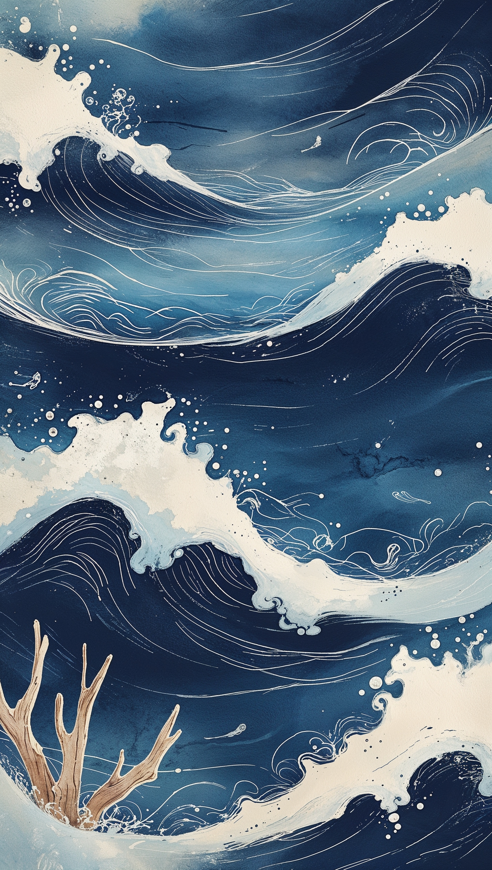 Vintage-style ocean sketch in navy blue and off-white tones 1664x2944 Vintage-style ocean sketch in navy blue and off-white tones