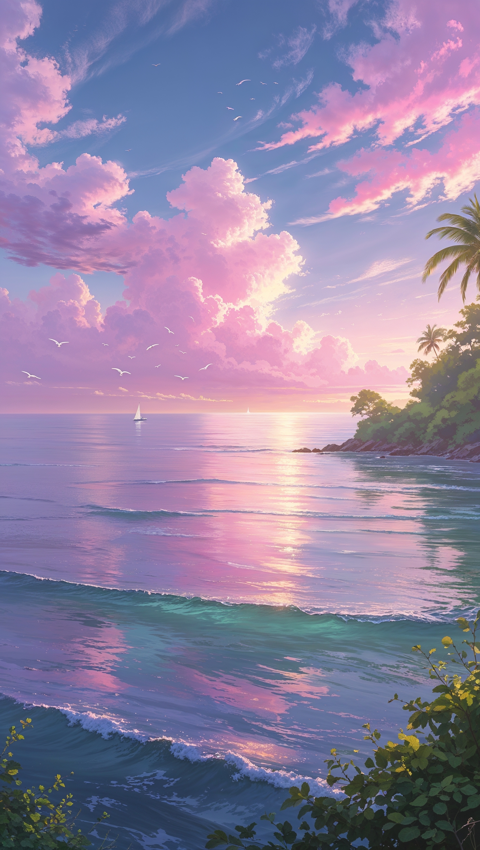 Ocean scene with sailboat in the distance and birds flying overhead 1664x2944 Ocean scene with sailboat in the distance and birds flying overhead