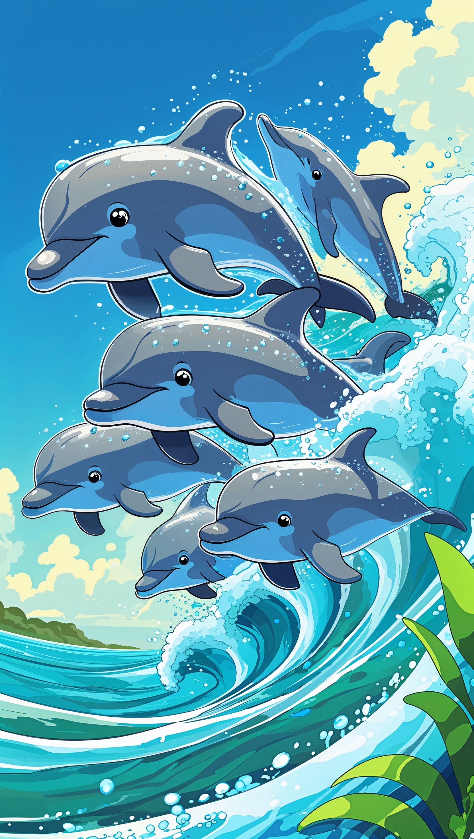 Cute cartoon-style ocean wallpaper with dolphins jumping from waves 1664x2944 Cute cartoon-style ocean wallpaper with dolphins jumping from waves