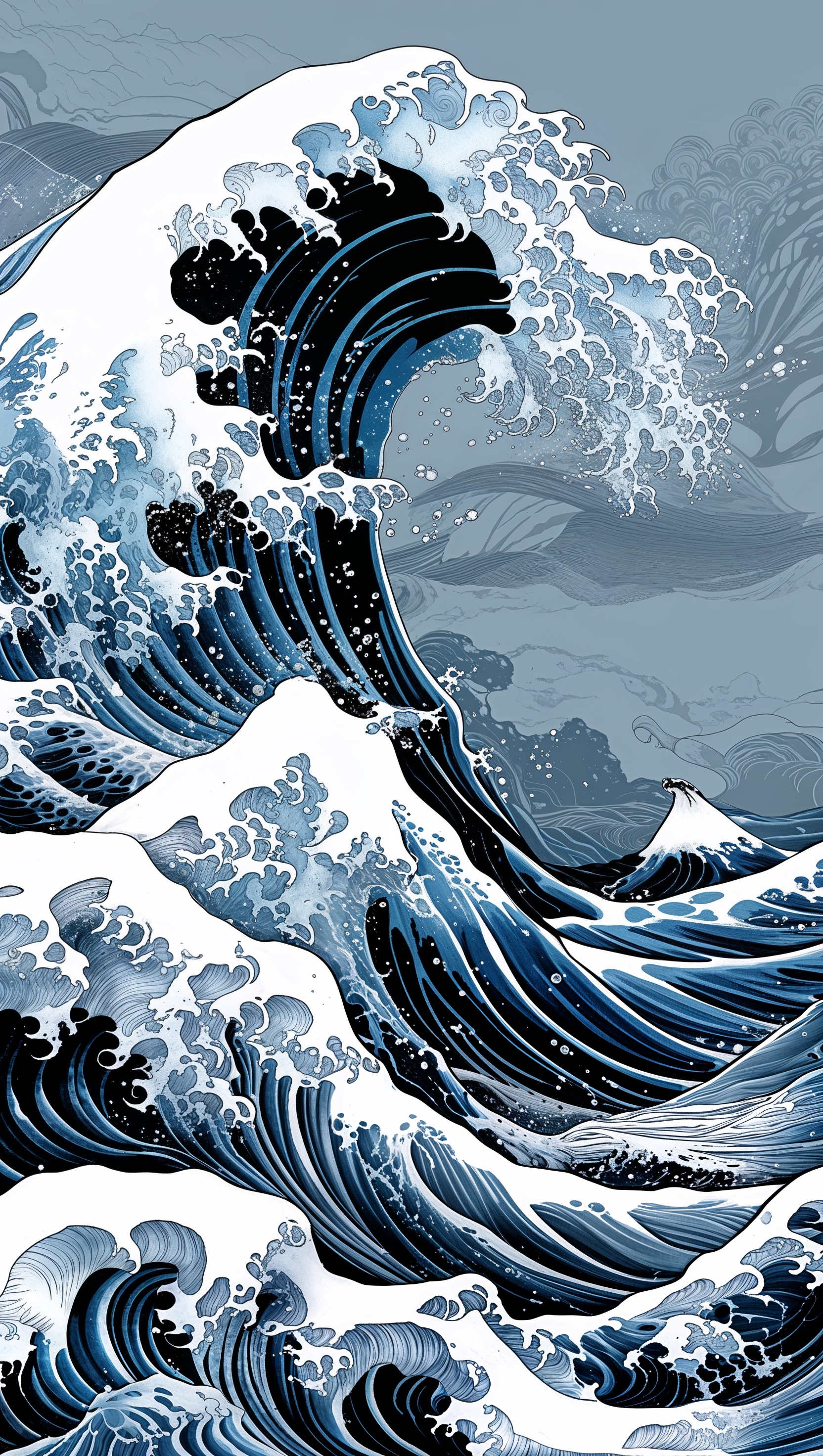 Stylized line art of ocean waves in Japanese Hokusai style 1664x2944 Stylized line art of ocean waves in Japanese Hokusai style