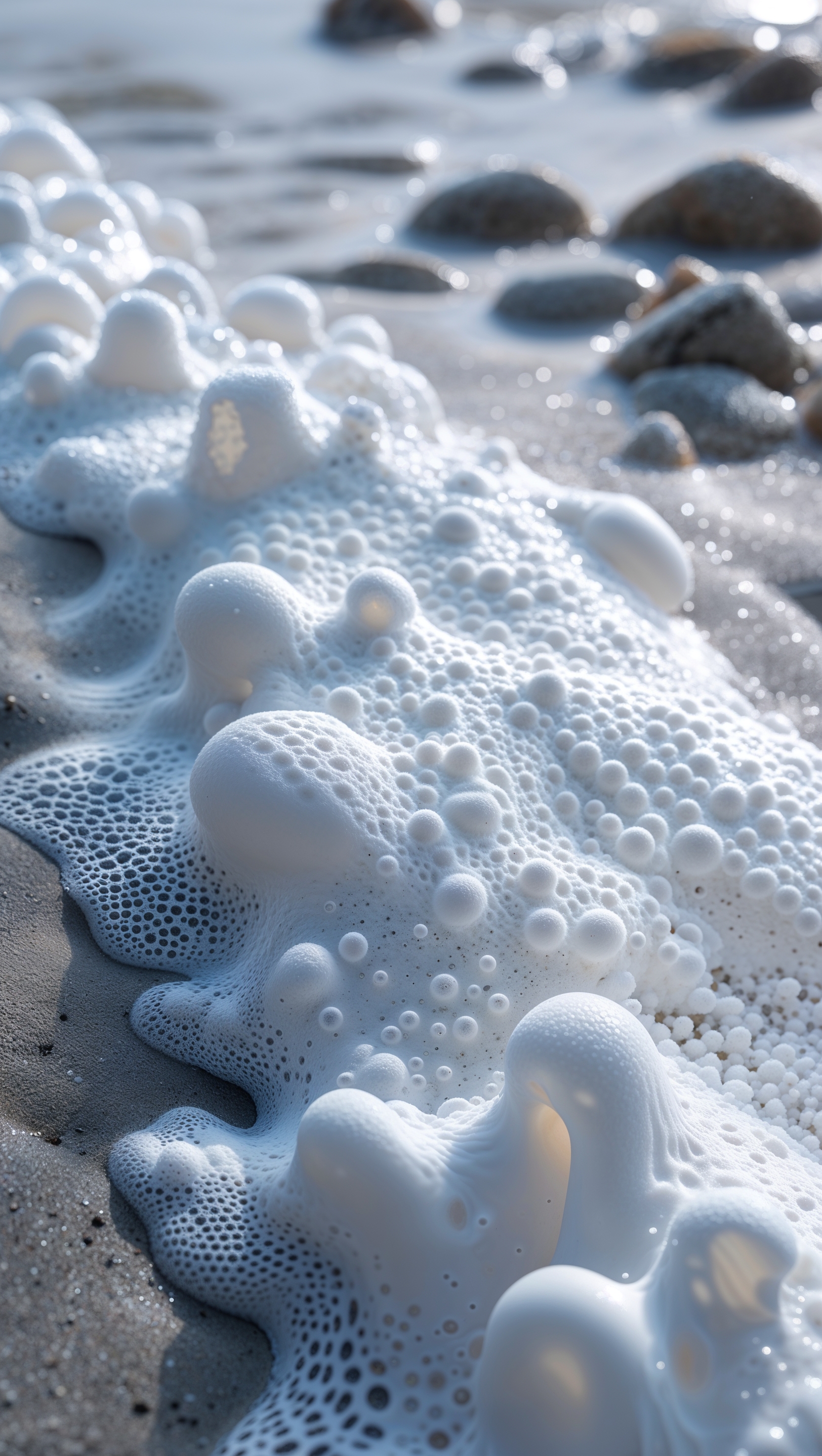 White foam on shorelines captured close-up, with texture-rich detail 1664x2944 White foam on shorelines captured close-up, with texture-rich detail