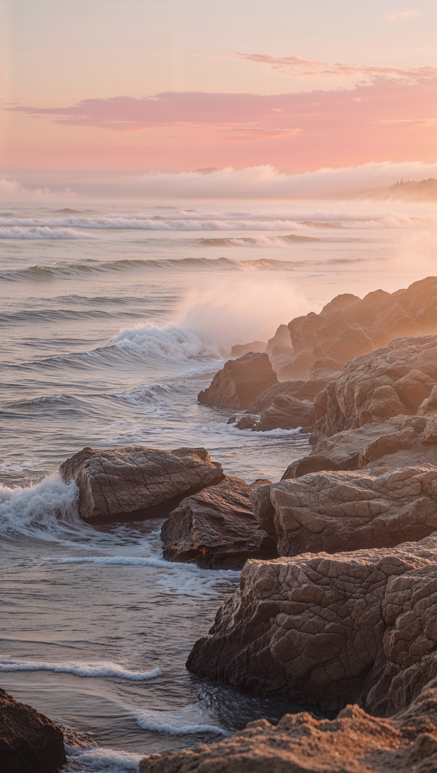 Waves gently hitting rocks during golden hour, warm tones and peaceful mood 1664x2944 Waves gently hitting rocks during golden hour, warm tones and peaceful mood