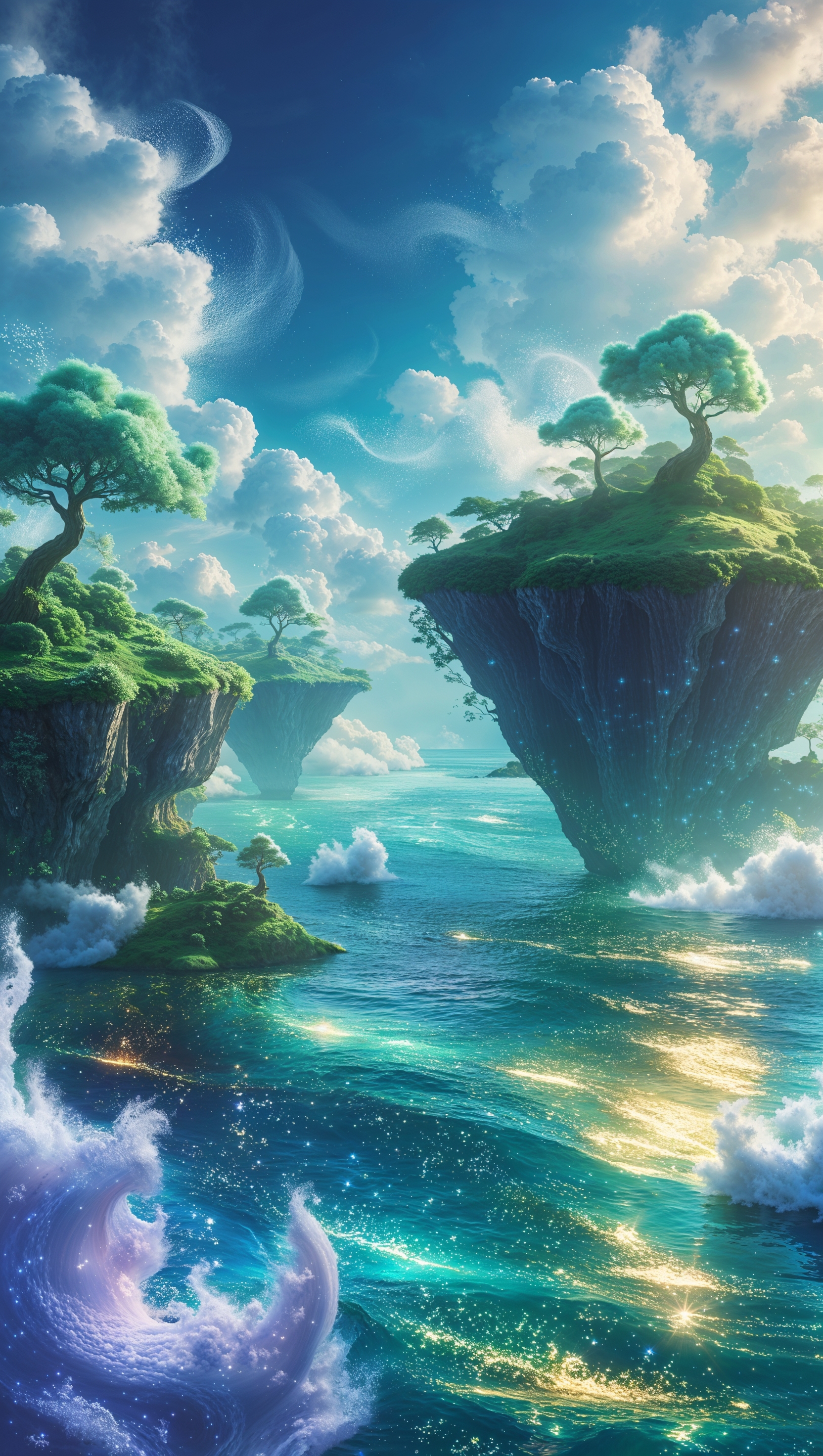 Fantasy-style ocean with floating islands and glowing water, surreal and imaginative 1664x2944 Fantasy-style ocean with floating islands and glowing water, surreal and imaginative