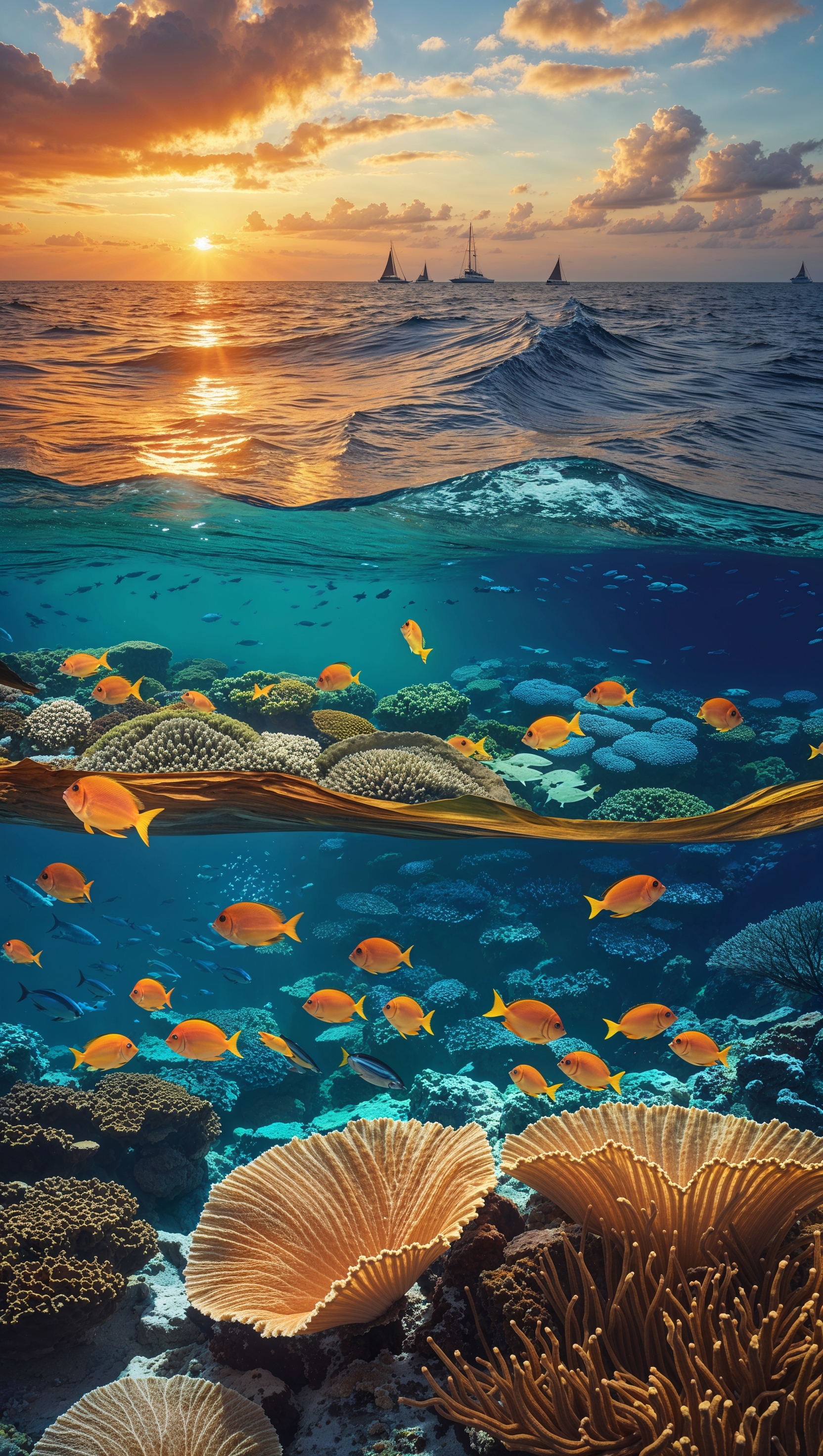 Ocean split view with above-water sunset and below-water coral reef 1664x2944 Ocean split view with above-water sunset and below-water coral reef