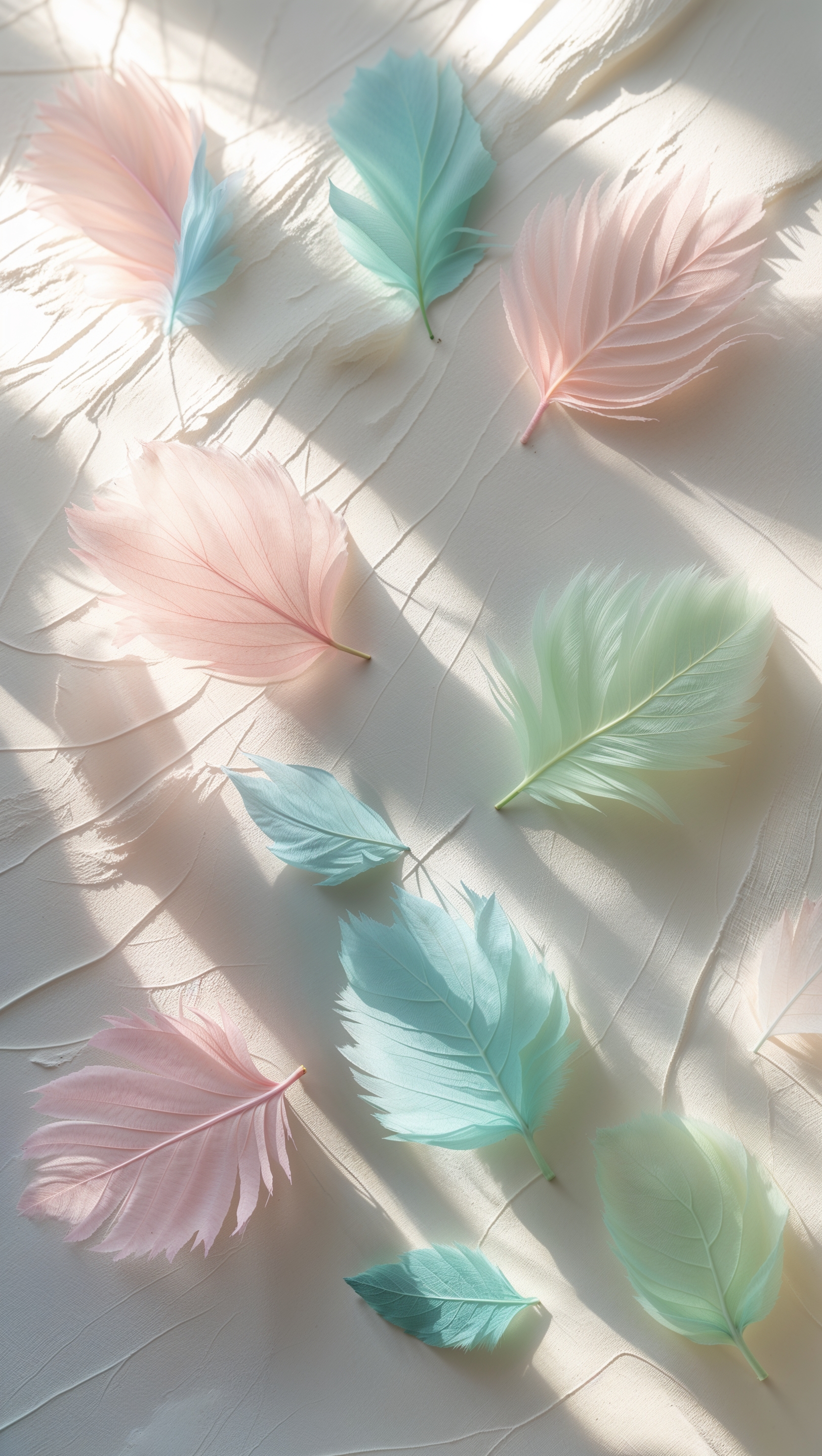 Delicate pastel leaves scattered across clean white background 1664x2944 Delicate pastel leaves scattered across clean white background