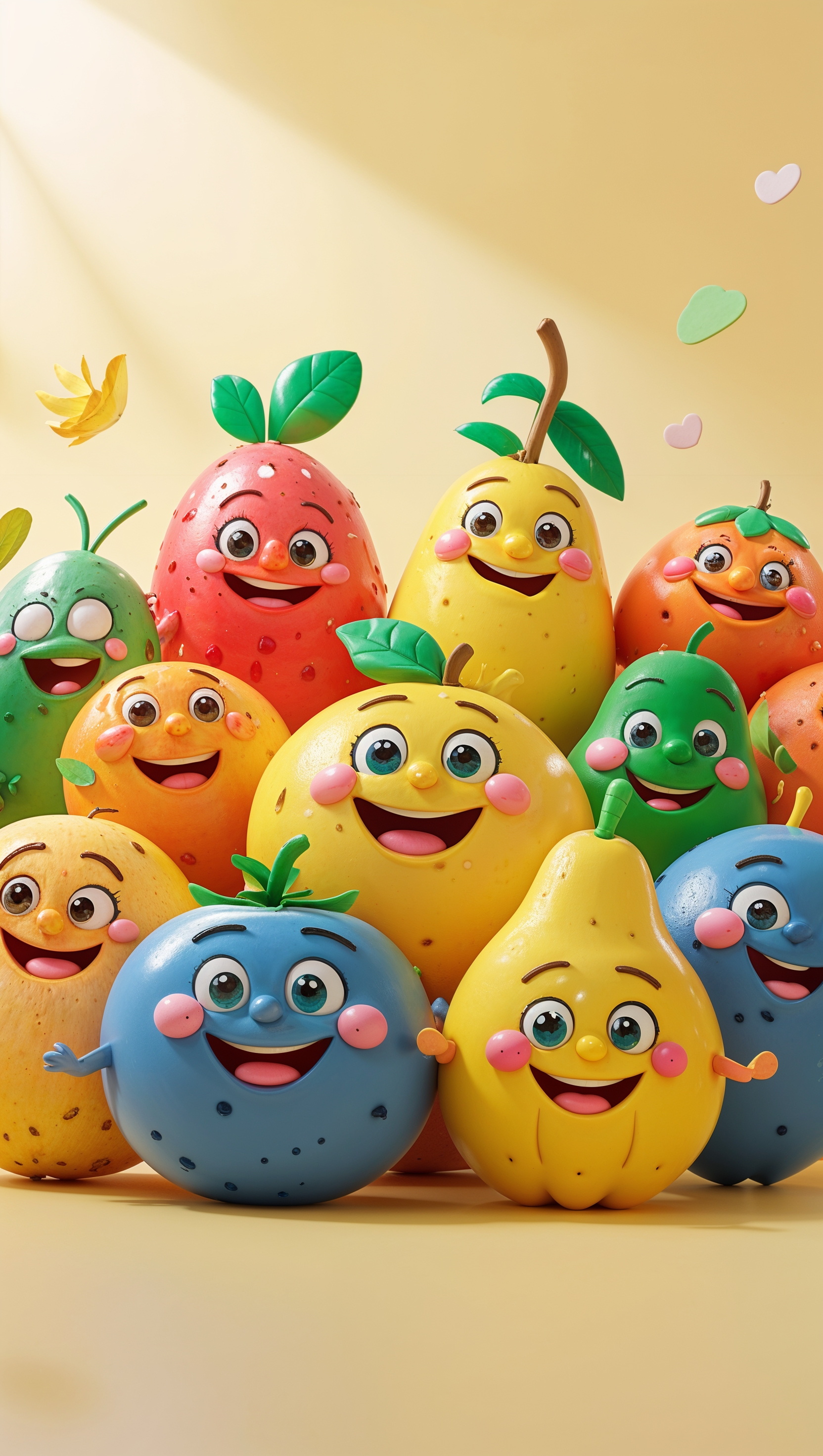 1664x2944 Cute cartoon fruit characters smiling on light yellow background