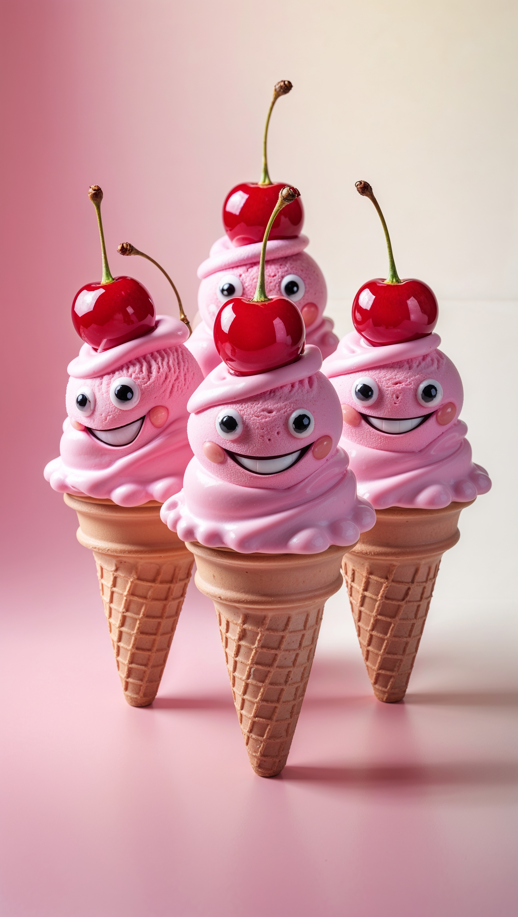 1664x2944 Smiling ice cream cones with cherry toppings on pale pink