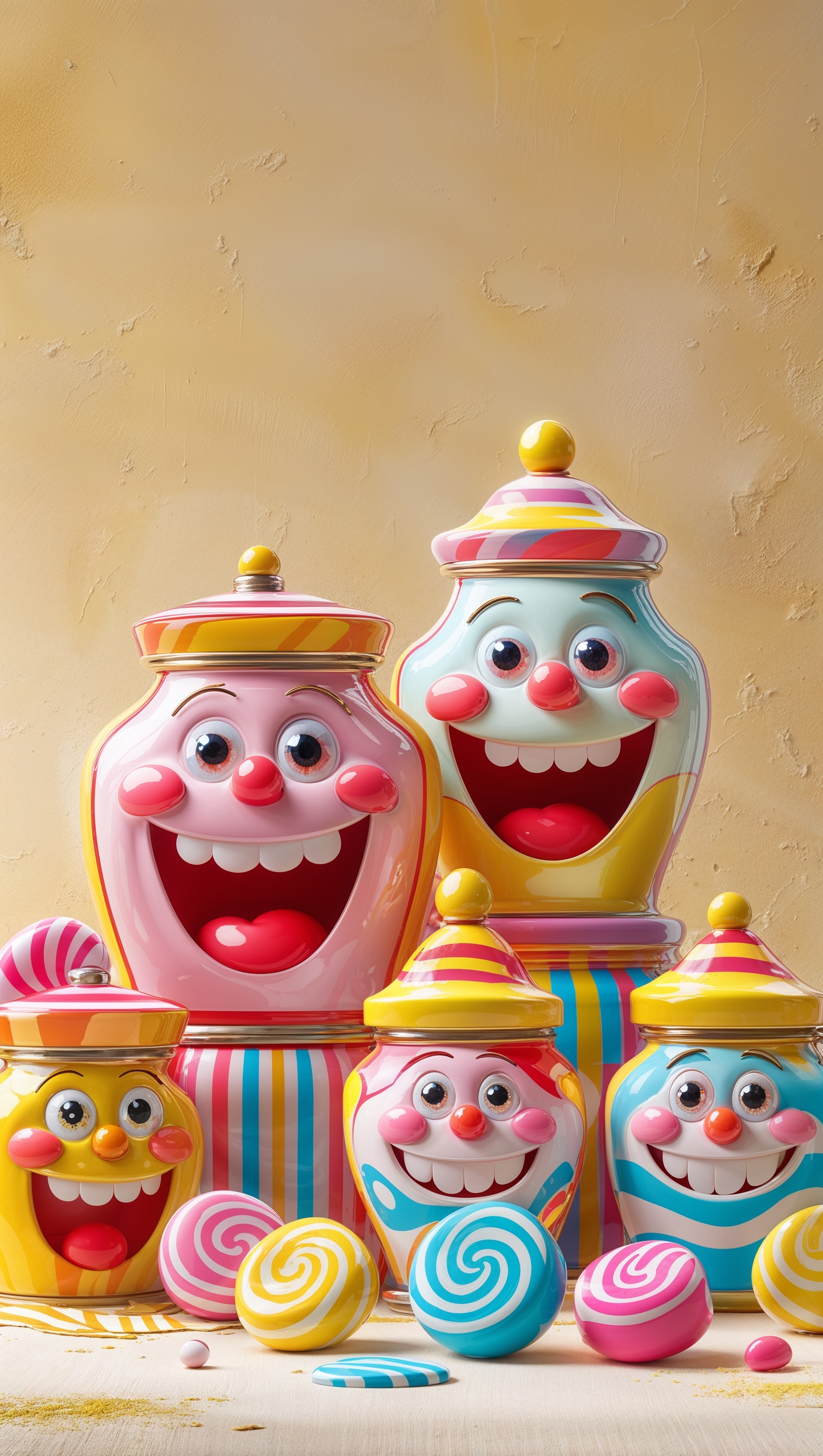 1664x2944 Cartoon candy jars with smiling faces on pastel yellow background