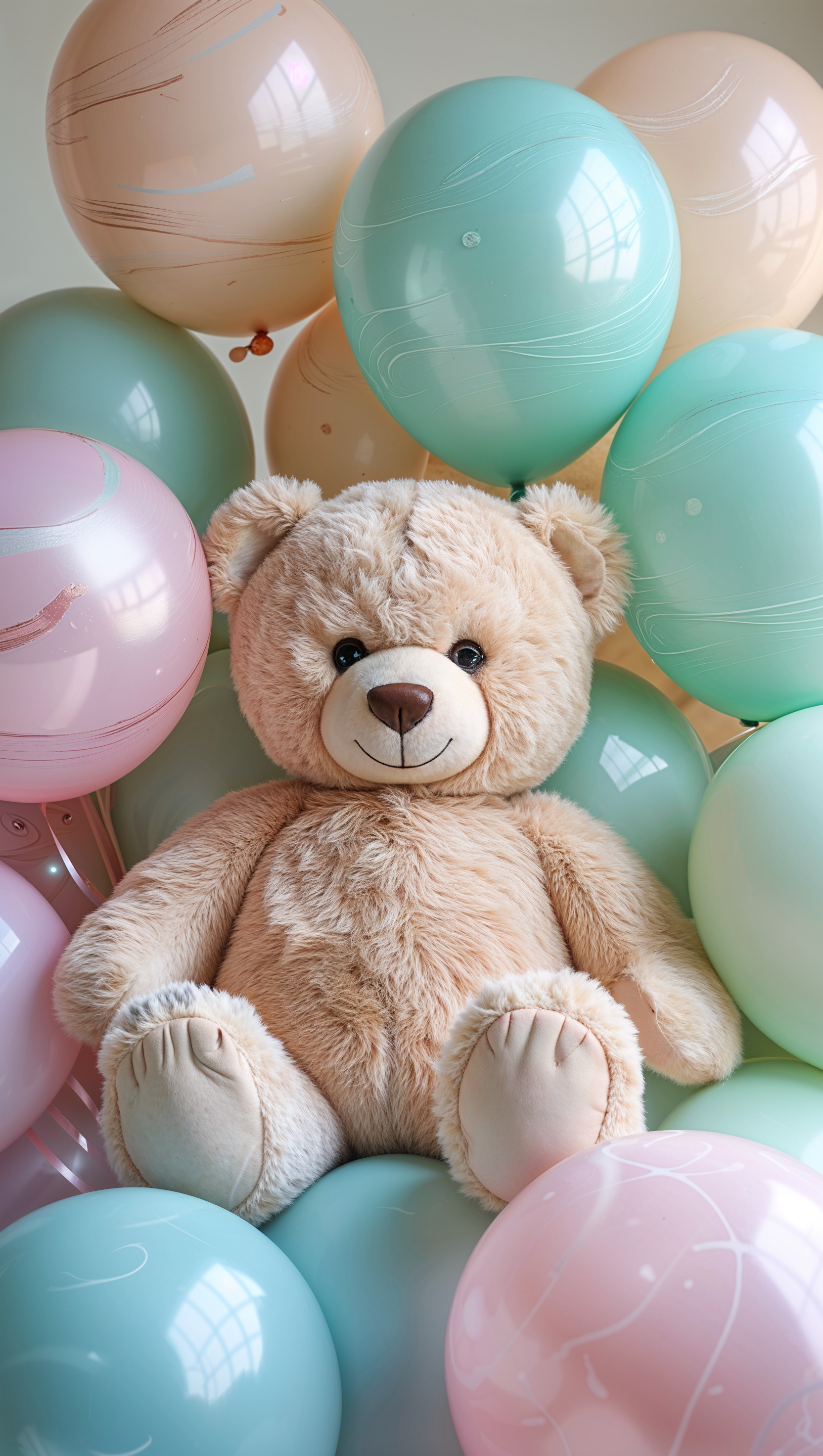 1664x2944 Cute teddy bear sitting among pastel-colored balloons