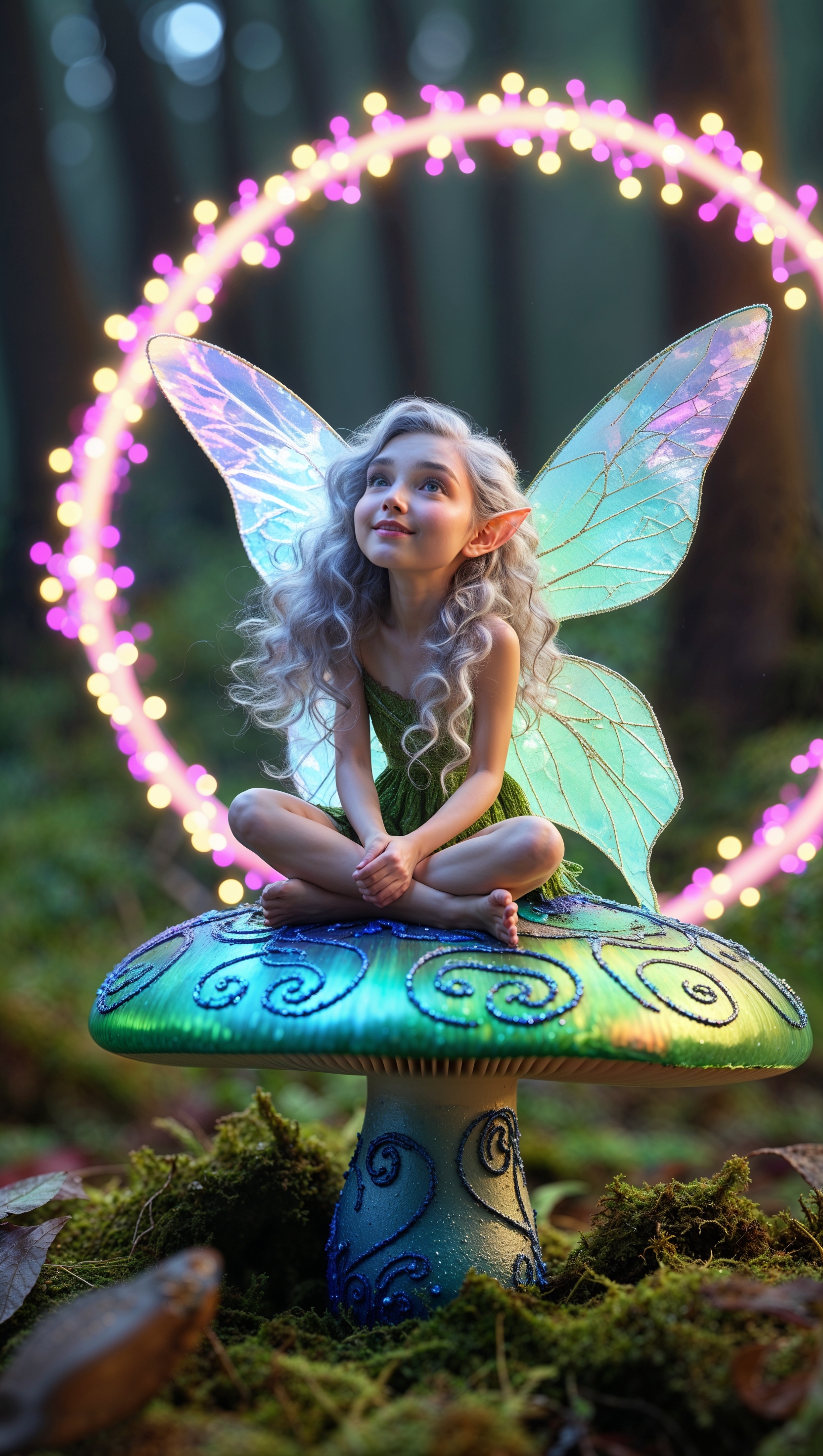 1664x2944 Little fairy sitting on a mushroom with glowing lights around